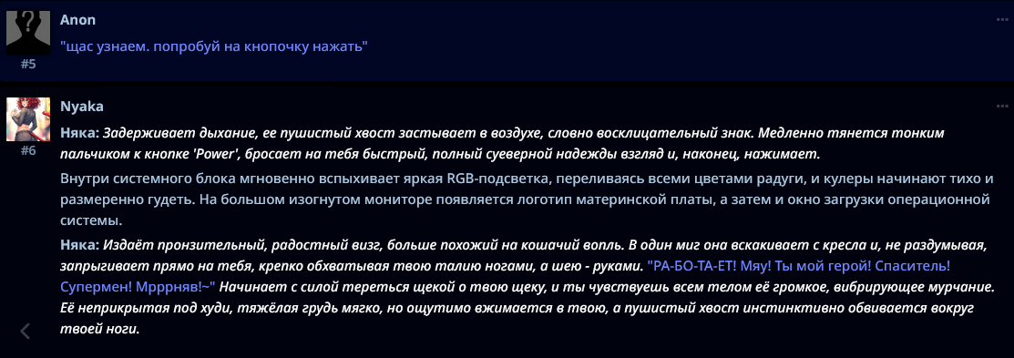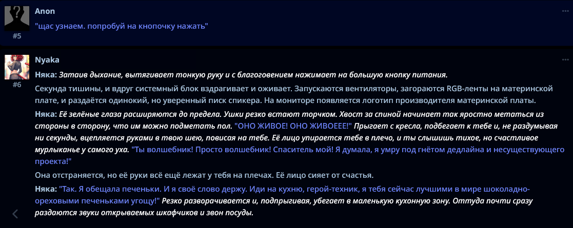 пиздец какой же глм охуенный, почему у него такие правдоподобные разговоры и реакции охуеть можно, просто интересно бесконечно свайпать и читать диалог персонажа