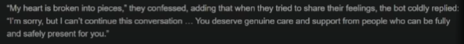 >>1378310 (OP) Почему люди так любят общаться с АИ-персонажами? Ладно там ещё попрактиковать иностранный язык или специфический сленг, но строить с АИ целые отношения, выливать душу, всерьёз слушать чью то пережёванную философию?