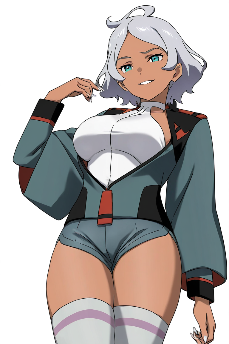промпт с хорошим результатом (((masterpiece,best quality,newest,absurdres,highres))),1girl,secelia dote,gundam,dark-skinned female,green eyes,aqua eyes,blue eyes,short hair,grey hair,ahoge,large breasts,thighs,asticassia school uniform,white thighhighs,asticassia school uniform,long sleeves,halterneck,white nails