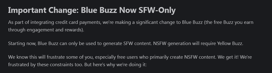 Им надо было сразу позиционировать себя как privacy-oriented провайдер гпу-мощностей для произвольных моделей с возможностью загрузки своих моделей и с системой кредитов, которые можно от юзера к юзеру "дарить" и чтобы доступ к таким обменам кредитами был доступен по АПИ. А рядом держать не сильно аффилированный сайт для шаринга контента, который так случайно выходит, что поддерживает эту апишку.