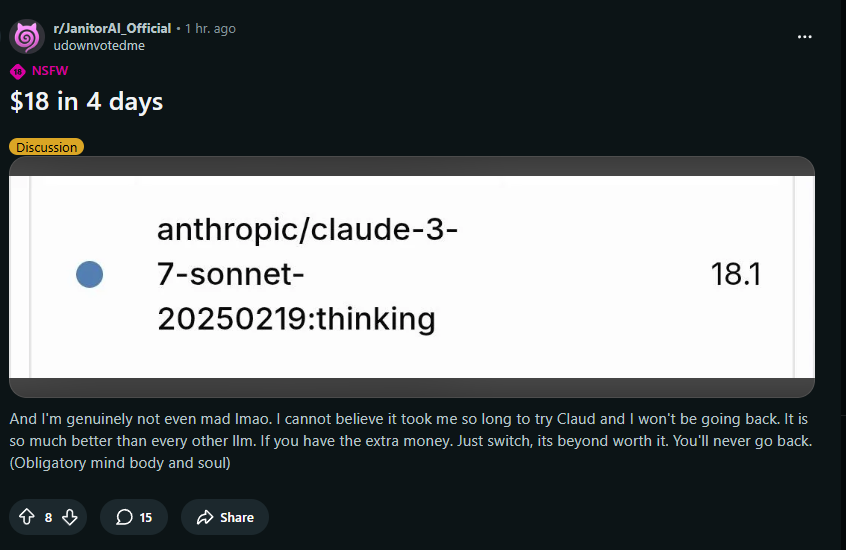 Для тех, кто вообще не шарит в этой теме — модели Claude очень популярны для рп зарубежом. В народе их очень-очень любят, но стоят они очень-очень-очень дорого.