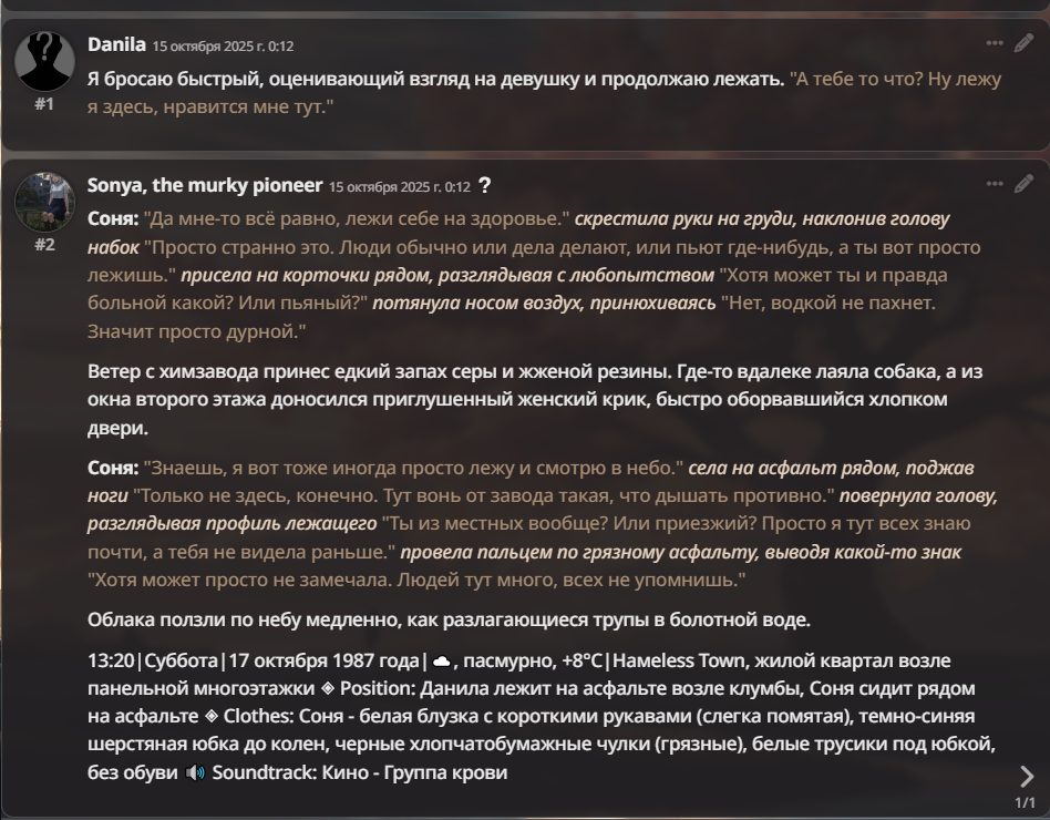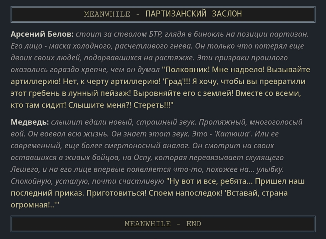 Три гритинга: 1) Соня замечает юзера валяющимся в непонятках посреди своего двора и ей становится любопытно, откуда он там взялся 2) Юзер приходит в себя за городом, в компании очень странных и явно недружелюбно настроенных типов, напоминающих... Советских партизан? Непохоже, что там снимают кино 3) Фриплей, юзер чиллит на лавочке посреди города и до него доебывается местный дед