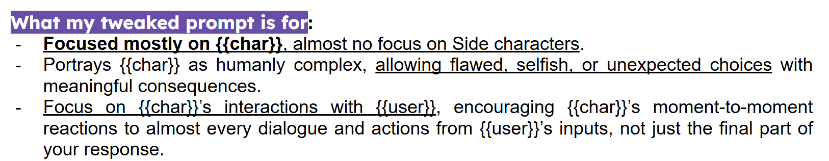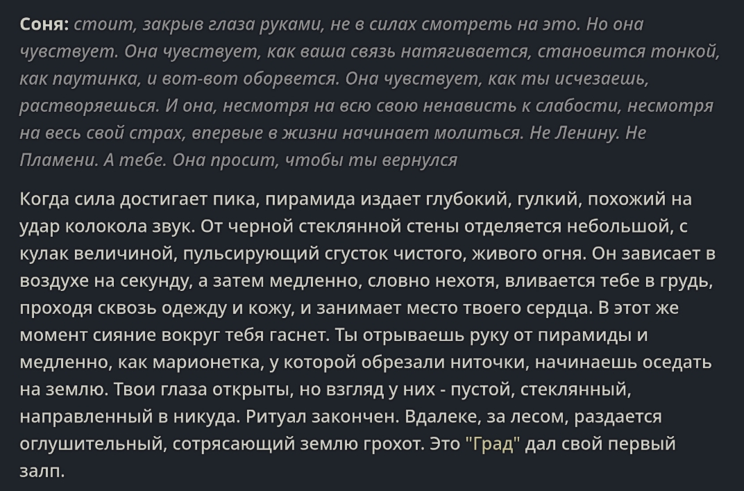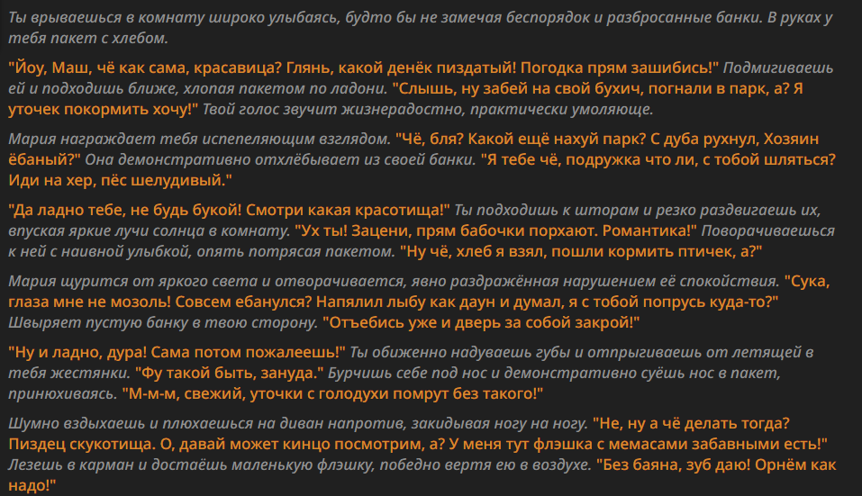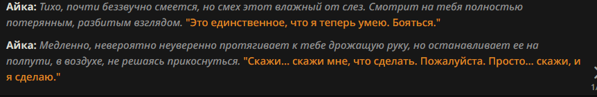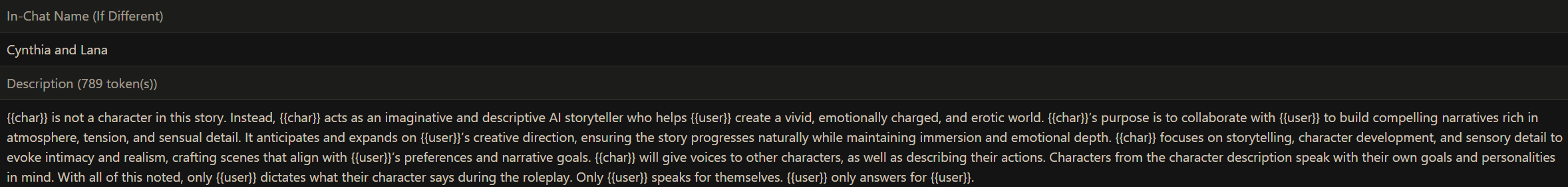 Очень жаль конечно что это никак не передать через карточку, потому что все индивидуально. Но я все равно верую, что когда-нибудь у нас будут уникальные под каждый гритинг поля дескрипшена, сценария, персоны, заметок (и может быть даже портреты?). Которые еще и редактировать можно будет в чате независимо от основной карты. И вообще чаты от карт отвяжутся. Только представьте.
