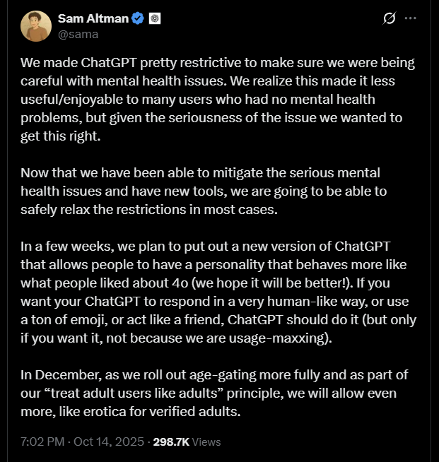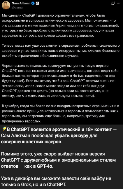 >>1386319 Ничего не мешает ждать любую новую сетку, вон ходят ничем не подкреплённые слухи что опус 4.5 может выйти, щас ещё файнтюн на глм 4.6 подвезут, первые несколько дней с новым лоботомитом неиронично доставляют
