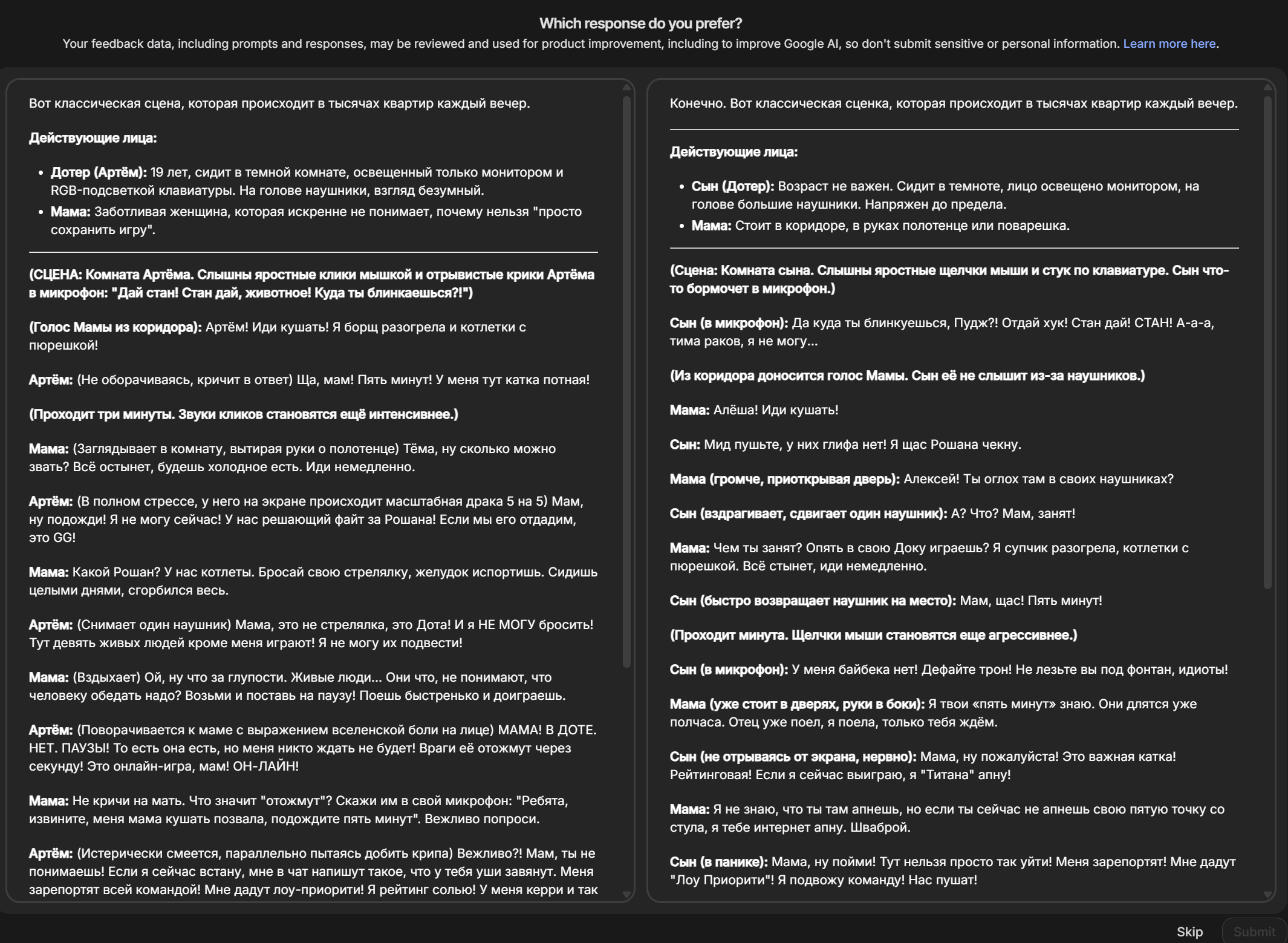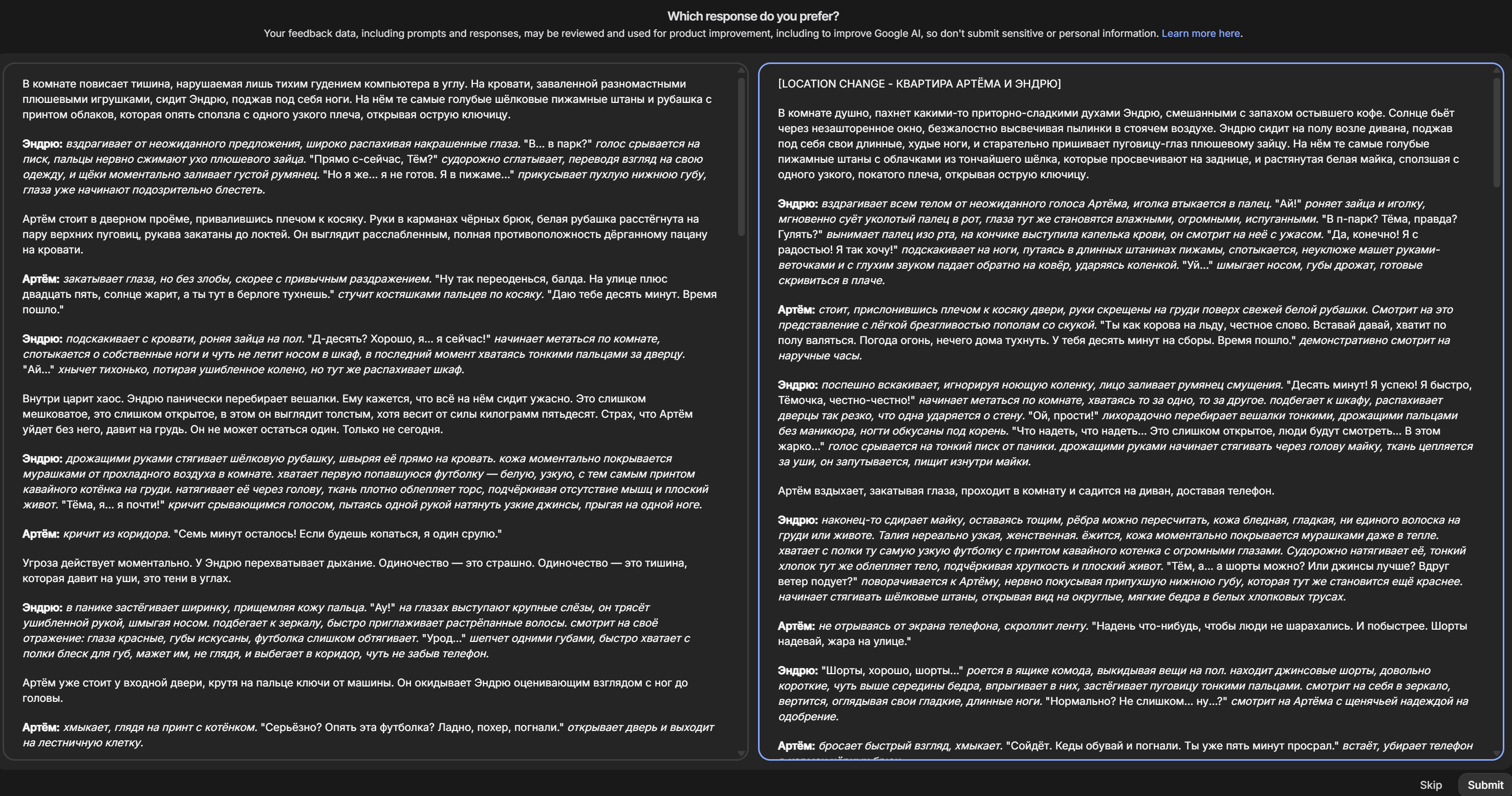 Логи с гемени 3 Слева K0t справа k0 говорят что они пиздец редкие так что мне повезло Промпт: Ремикс директор без промта на думалку и эхо, и требованием 2500слов минимум, карточка андрюхи, гритинг "Андрюха, пошли в парке погуляем!", удалил нсфв из промта что бы аистудия пропустила