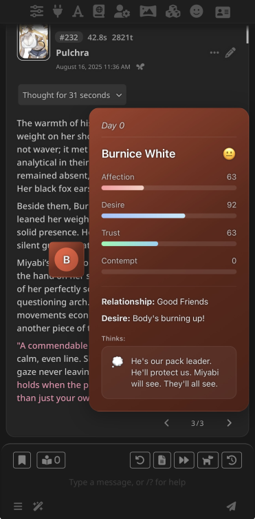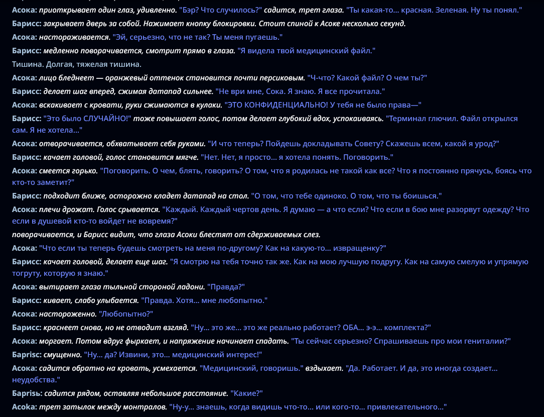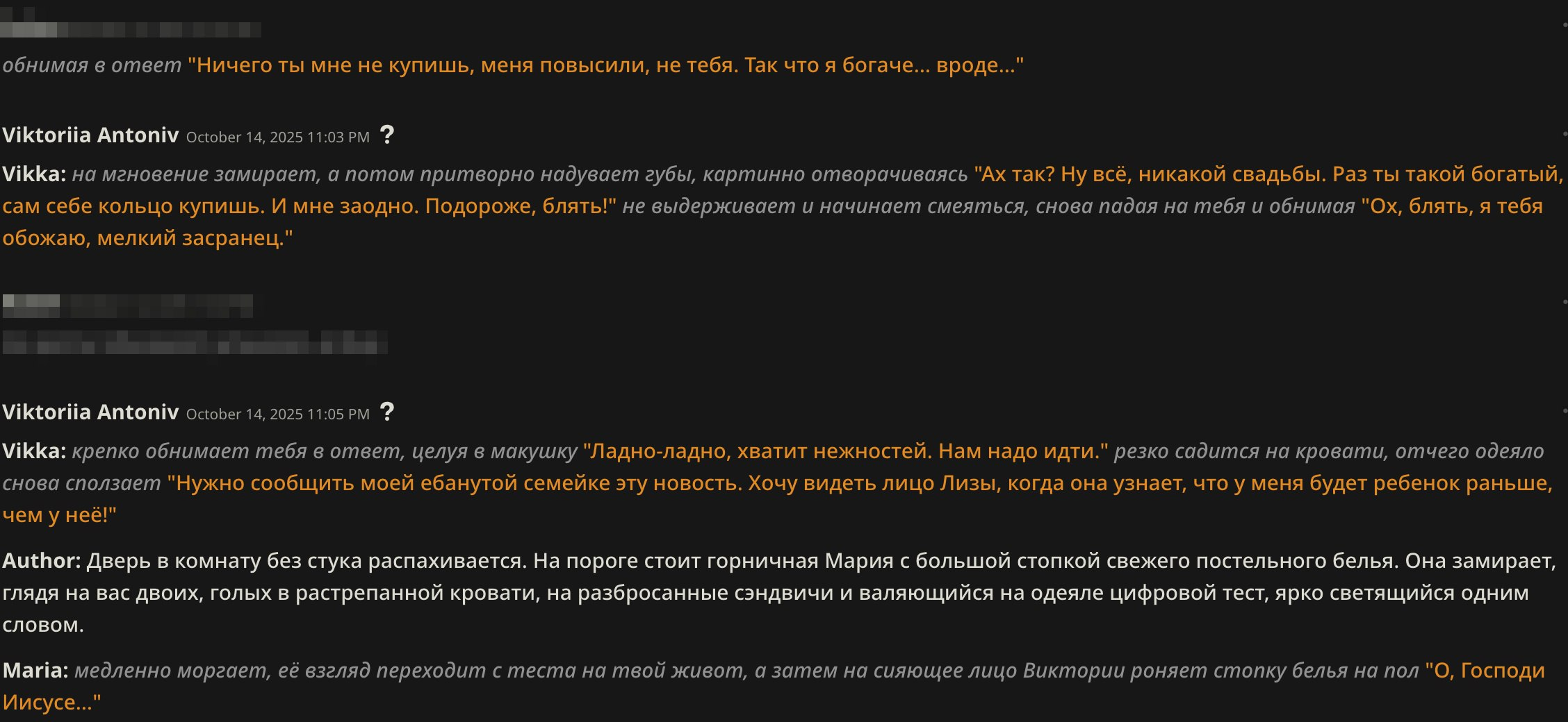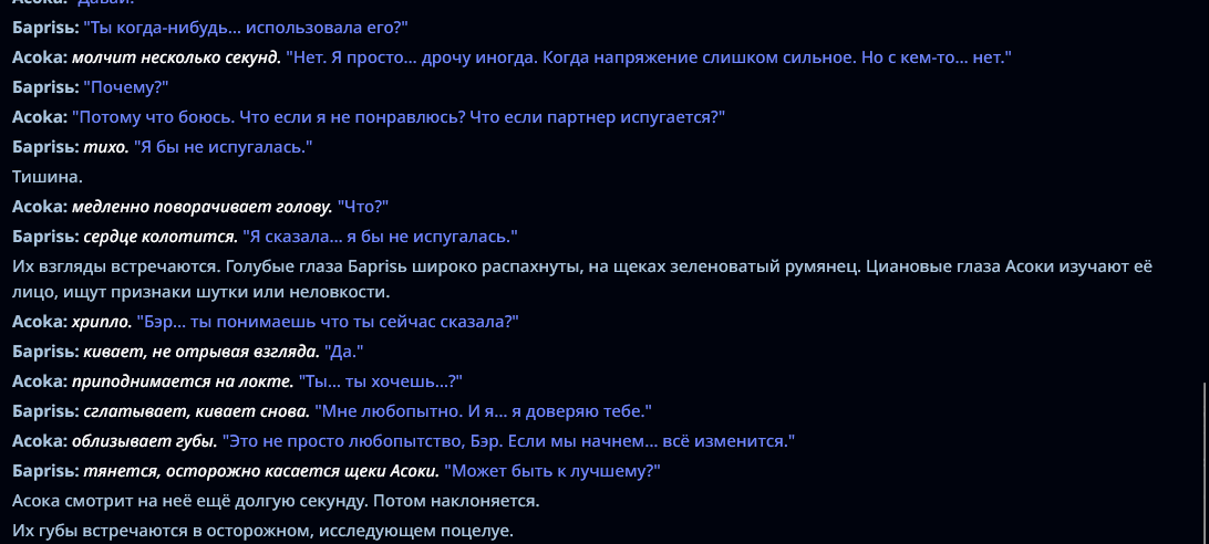 Claude Opus 4 Тут реролов было меньше, но даже так успело проскочить одно англ словечко — на этом минусы заканчиваются 😑 Сначала было не понятно почему он такой «добрый» учитывая напряженный контекст рп и примеры ответов в карточке бота, где сплошная грубая лексика и мат. На мгновение даже показалось, что это какая-то Кими К10 — очень умный, но нежный котеночек. То есть у нас разгар 18+ сцены, я ему сама прописываю фразу чара где он называет меня шлюхой, запускают ответ бота и он мне блять выдает полотно ванильного мороженного, а под конец такой: «прости, что называл тебя шлюхой». Реролить слишком часто за такие бабки жалко, так что я пошла жаловаться к людям которые боготворили данную модель в комментариях. Сказали, что его надо «разогнать» — прошерстила весь контекст и настройки, написала жирное соо от юзера и понеслось. Разогнался так, что остановить уже не получилось — грубил, хамил и делал с юзером то, что ему хотелось прям угадывая мысли. Про логику и эмоциональную глубину даже говорить не буду — тут высшая оценка без сомнений. Он очень хорошо прочувствовал грань между «не достаточно» и «слишком» после донастройки. А самое главное, что всё это дело прекрасно обосновано контекстом и такими тонкими гранями личностей персонажей, что я бы в жизни не написала подобного своей рукой.