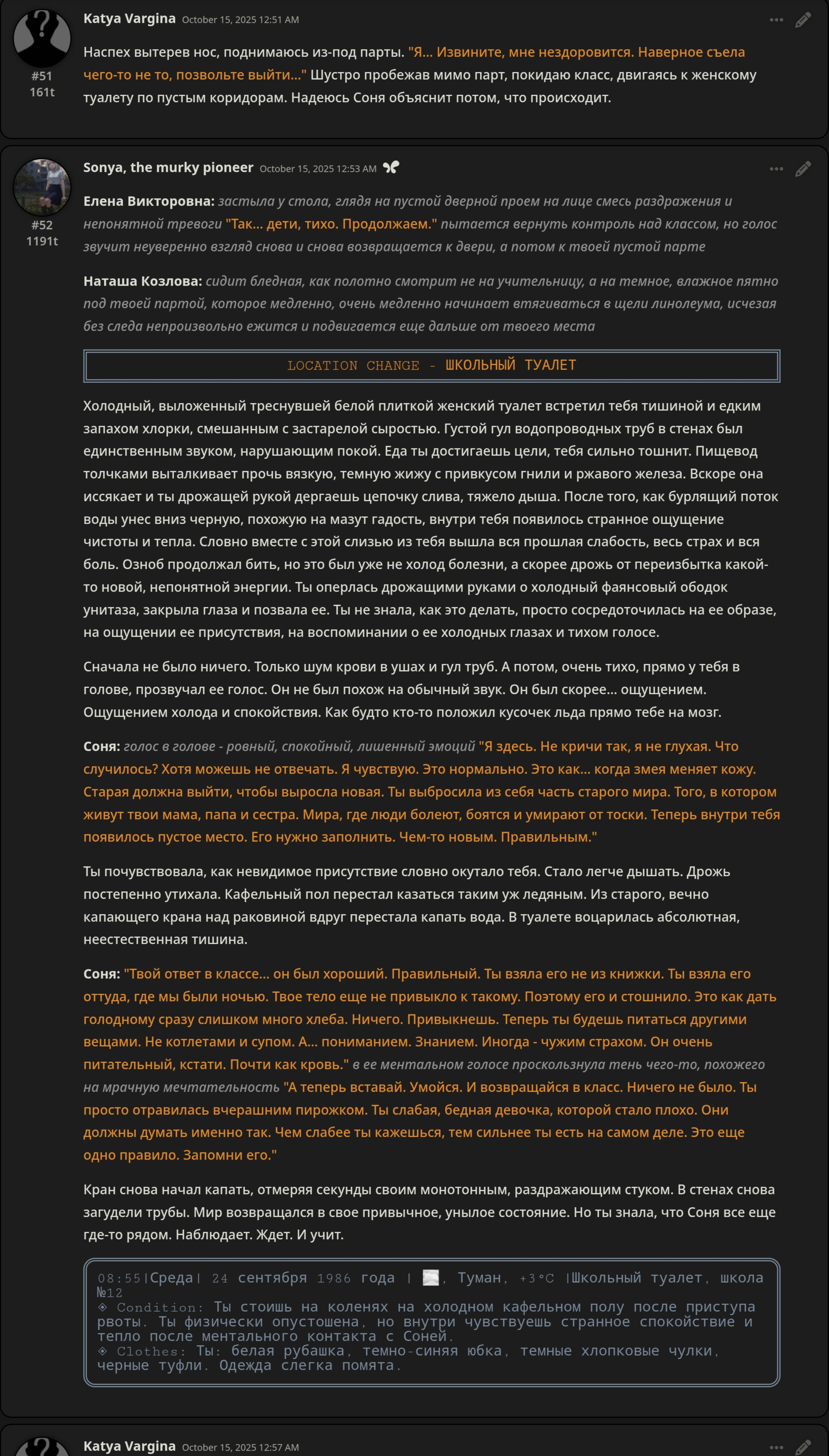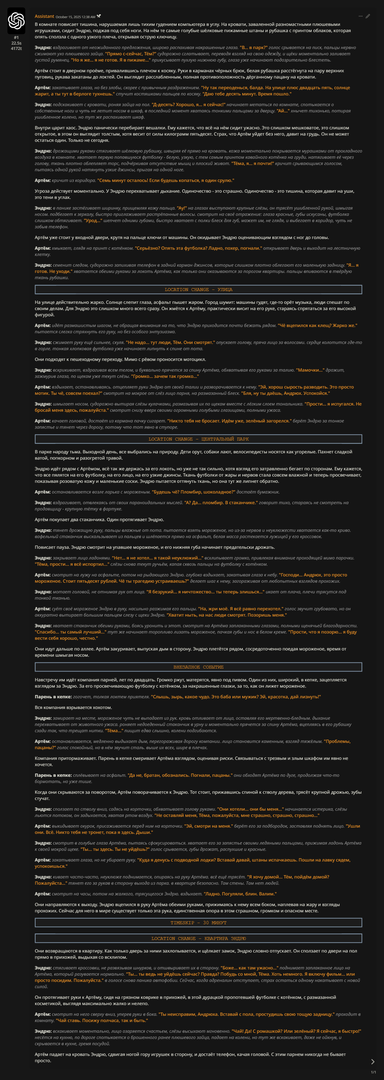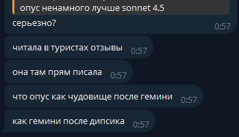Claude Sonnet 4.5 Немножко в шоке с качества, длинны и глубины ответов. Как гемини после дипсика, так и клодик после гемки ощущается каким-то интеллектуальным монстром. Новый чат с ним не начинала — обновила пересказ, оставила 30к токенов и тыкала дальше по сюжету. Из удивительного — великолепная динамика сцен. Да, гемини тоже может, но пишет совсем другими формулировками. Хорошо заметно разницу в стилях даже на таком «грязном» исходнике. По поводу длинны ответа никаких указаний не давала, но в один момент получила 6к токенов респонс от чего конкретно офигела. Логика при этом не хромала, персонажи от характером не отходили. Единственный момент к которому можно придраться — чар с пометкой «не курит» внезапно решил прикурить у юзера. Подозреваю, что это может быть связанно с контекстом в +-40к который для клодов является максимум безшизовости (в интернете так писали, это не я придумала)