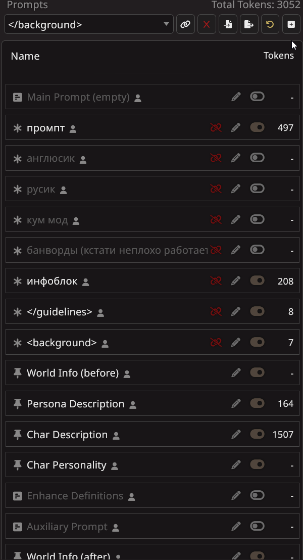 Кстати вот предложение на некст обнову фат пресетов. Сделать выбор при импортировании пресета, какие регексы и так далее импортировать. А то если мне регексы не нужны, но оно всё равно насрет ими и потом удалять их.