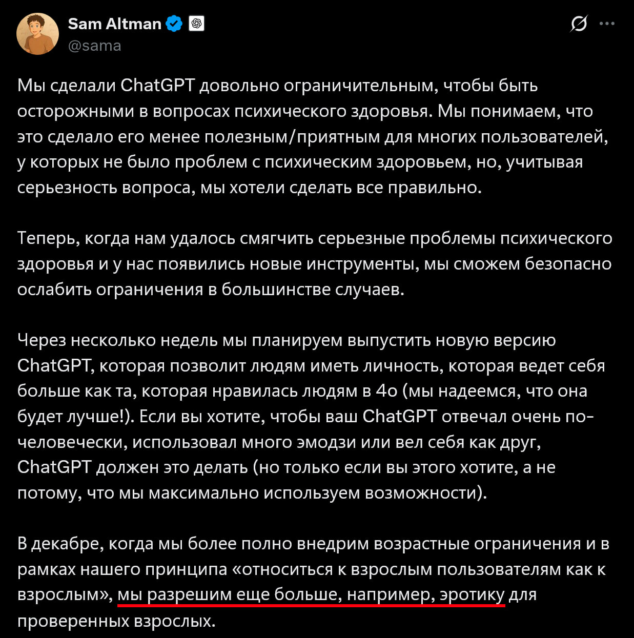 Из плюсов еще и то что на том же реддите люди пишут об этом. Если честно, я уже не могу даже с ассистентами нормально говорить, они тоже инпут пережёвывают и эхоразборят в каждом ответе. Использую в основном Клода, и с каждым днем все больше разочаровываюсь именно в вайбах, за которые и выбрал его как мейн драйвера ассистента в свое время. Сейчас мне больше всех Мистраль заходит, похож на Гемини полторашку немного, такой же тупенький милый.