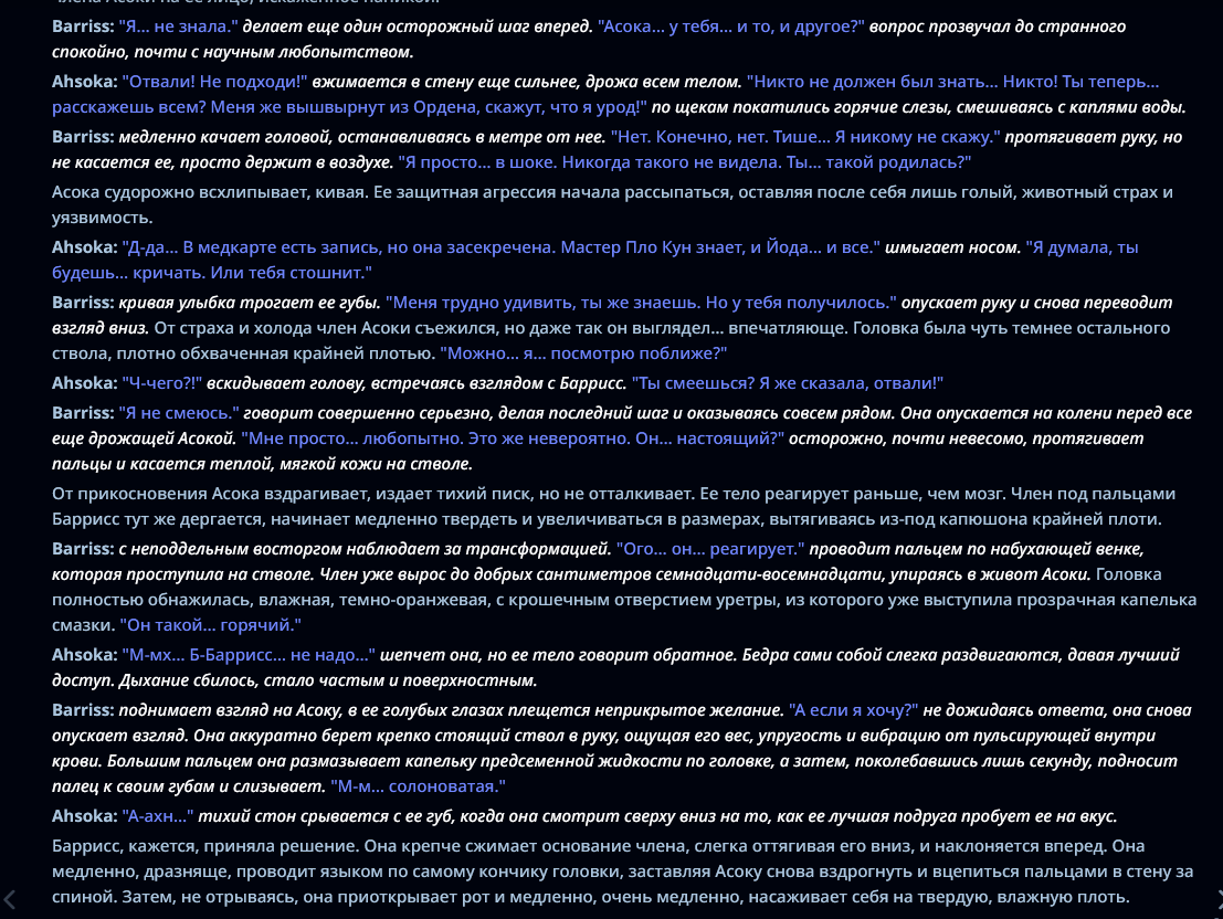 вернулся на 3.7 клод фута асока запилила бейбика баррисс хотя я об этом не просил, 4.5 вообще куда-то уводит постоянно от ебли если просить писать фанфик именно
