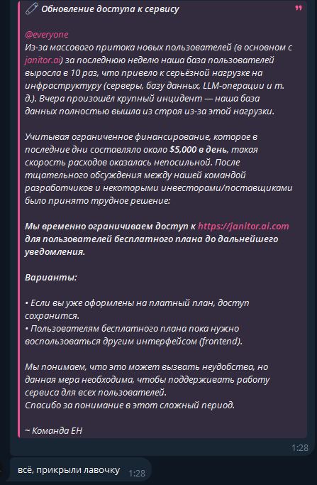 >>1387990 Да скорее поебать если всё взвесить, на проксях сидеть дело такое, лучше чтобы анончик мог взять и завезти своих бабок на помойки типа опенроутера и спокойно как белый господин пейпижить не переживая что девчушки-дрочушки все ключики отберут, были бы деньги просто платил бы за опус да и всё, коренная проблема не в саранче если уж на то пошло.