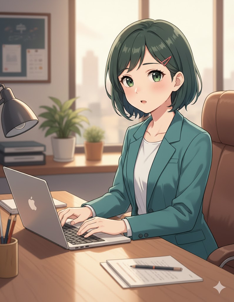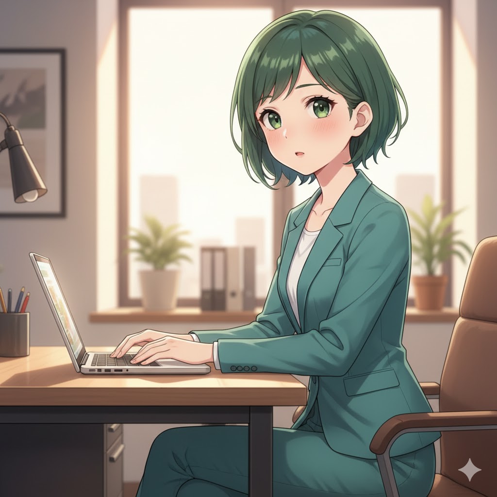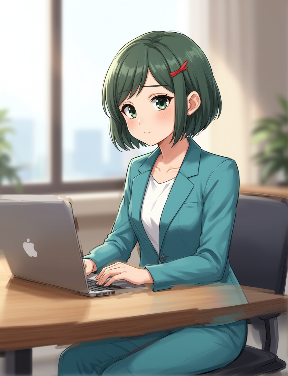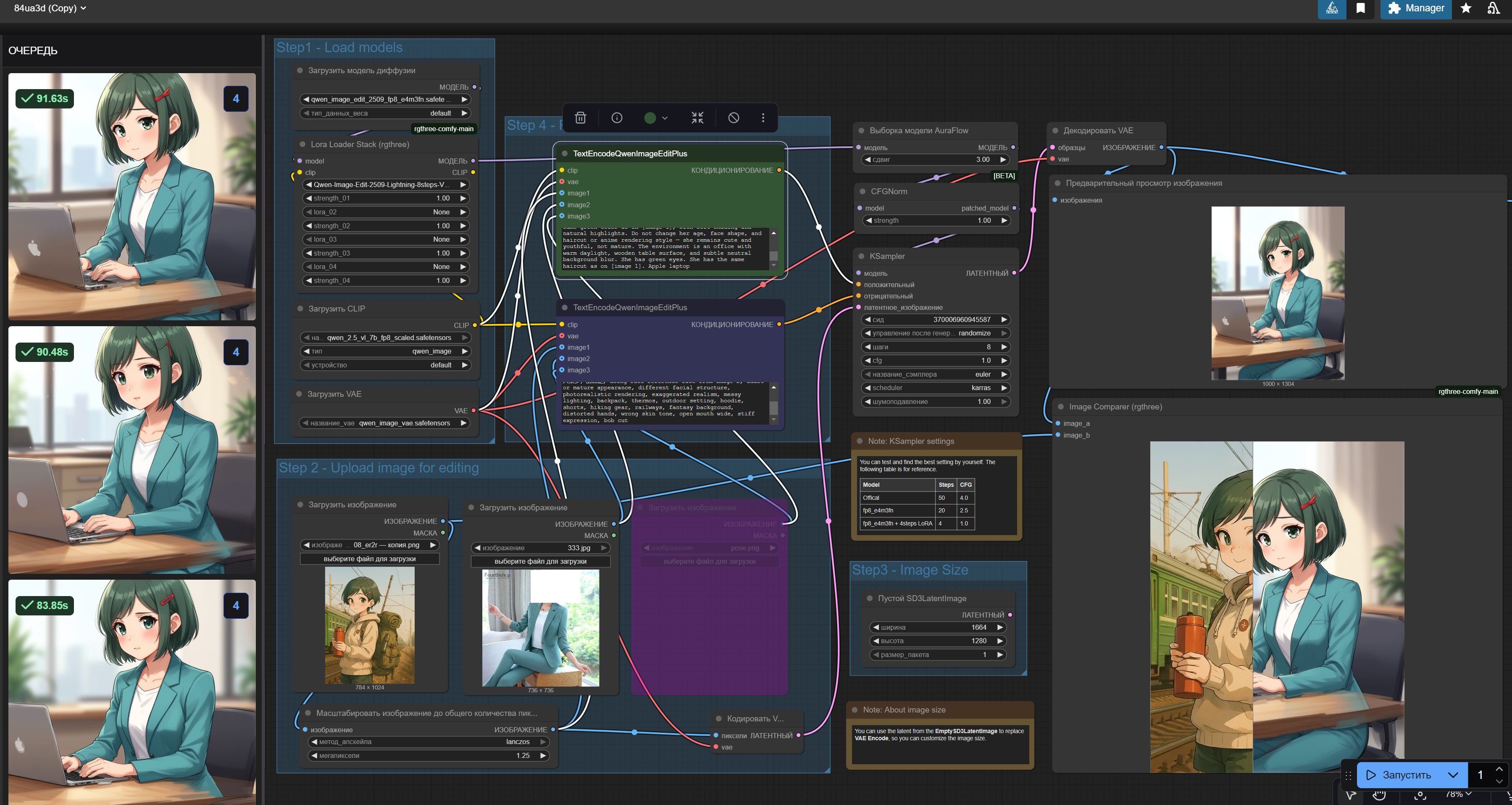 >>1392288 >>1379737 → В общем, похоже все настроил, скачал комфи менеджер (удобная штука). Единственное, я не стал пока переустанавливать через git clone и делал все через десктопную версию. Решил попробовать сделать пробные генерации с переодевание девушки с другую одежду и помещение ее в офис. Скорость генерации одной картинки составила 90-120 секунду (16vram. 32 ram). К сожалению качество генераций оказалось посредственным, картинка в целом довольно мыльная и есть проблемы с отрисовкой (см. пик 2). Также промте я прописал, чтобы прическа у нее была пикси, но все равно на всех генерациях нейронка лепит каре. Промт: Transform the girl from [image 1] into a modern indoor office environment, keeping all her original facial features, youthful charm, anime proportions, and soft innocent expression. She still looks like the same gentle young girl from [image 1], but now she is seated at a wooden office desk, working on an open laptop. She looks slightly toward the viewer with a shy, mildly flustered gaze and parted lips, giving a sense of quiet focus and nervous sweetness. Use only the clothing style and posture from [image 2] as a reference. Replace her hoodie and shorts with a teal women’s business suit — a fitted blazer with neat lapels and matching slim trousers, paired with a plain white blouse underneath. The color of the suit matches the soft turquoise tone of [image 2], but adapt it naturally to anime lighting. The fabric should look smooth and professional, with delicate folds and soft highlights. Her hairstyle becomes a clean pixie cut, very short and well-groomed with red haiclip on the left side, keeping the same green color as in [image 1], with soft shading and natural highlights. Do not change her age, face shape, and haircut or anime rendering style — she remains cute and youthful, not mature. The environment is an office with warm daylight, wooden table surface, and subtle neutral background blur. She has green eyes. Apple laptop