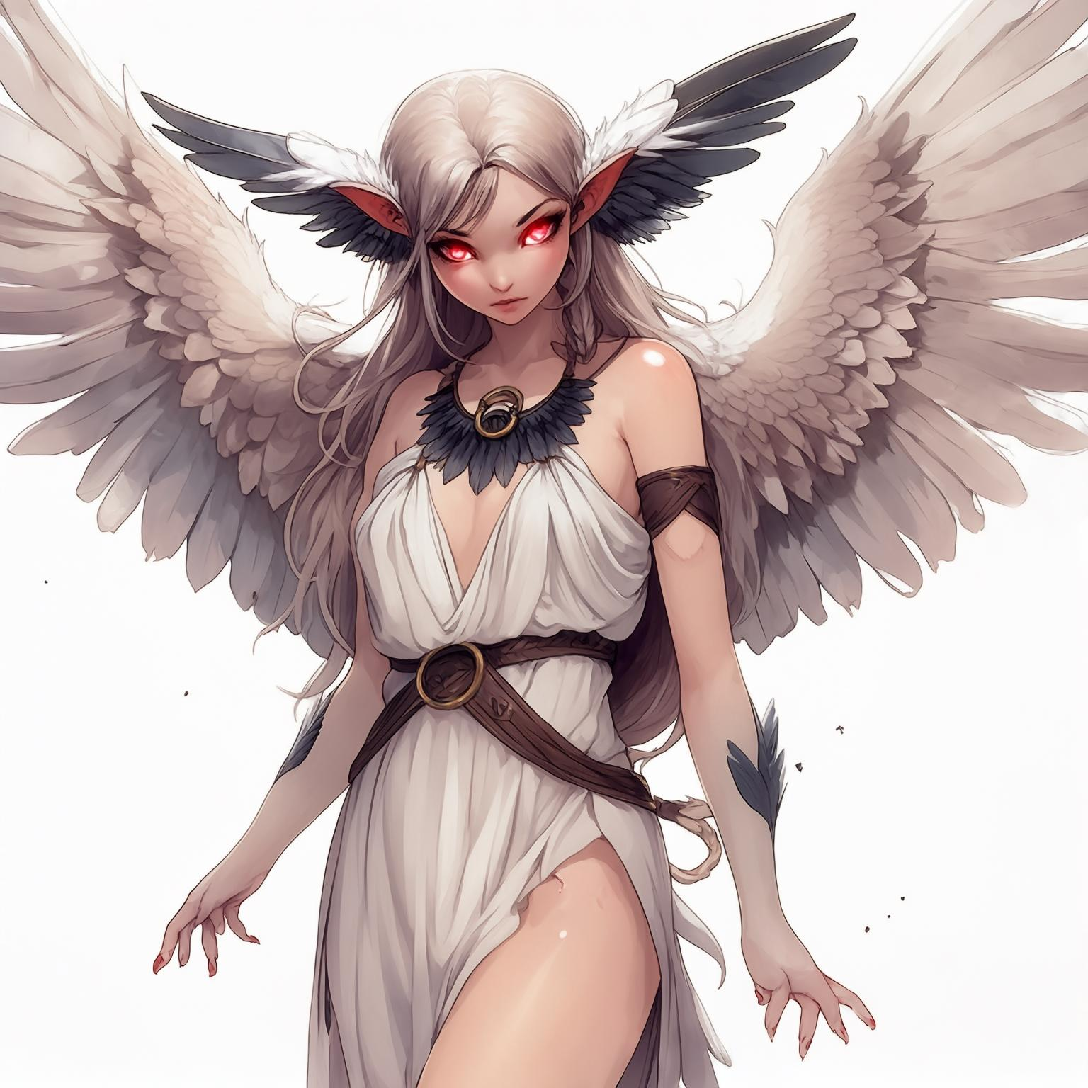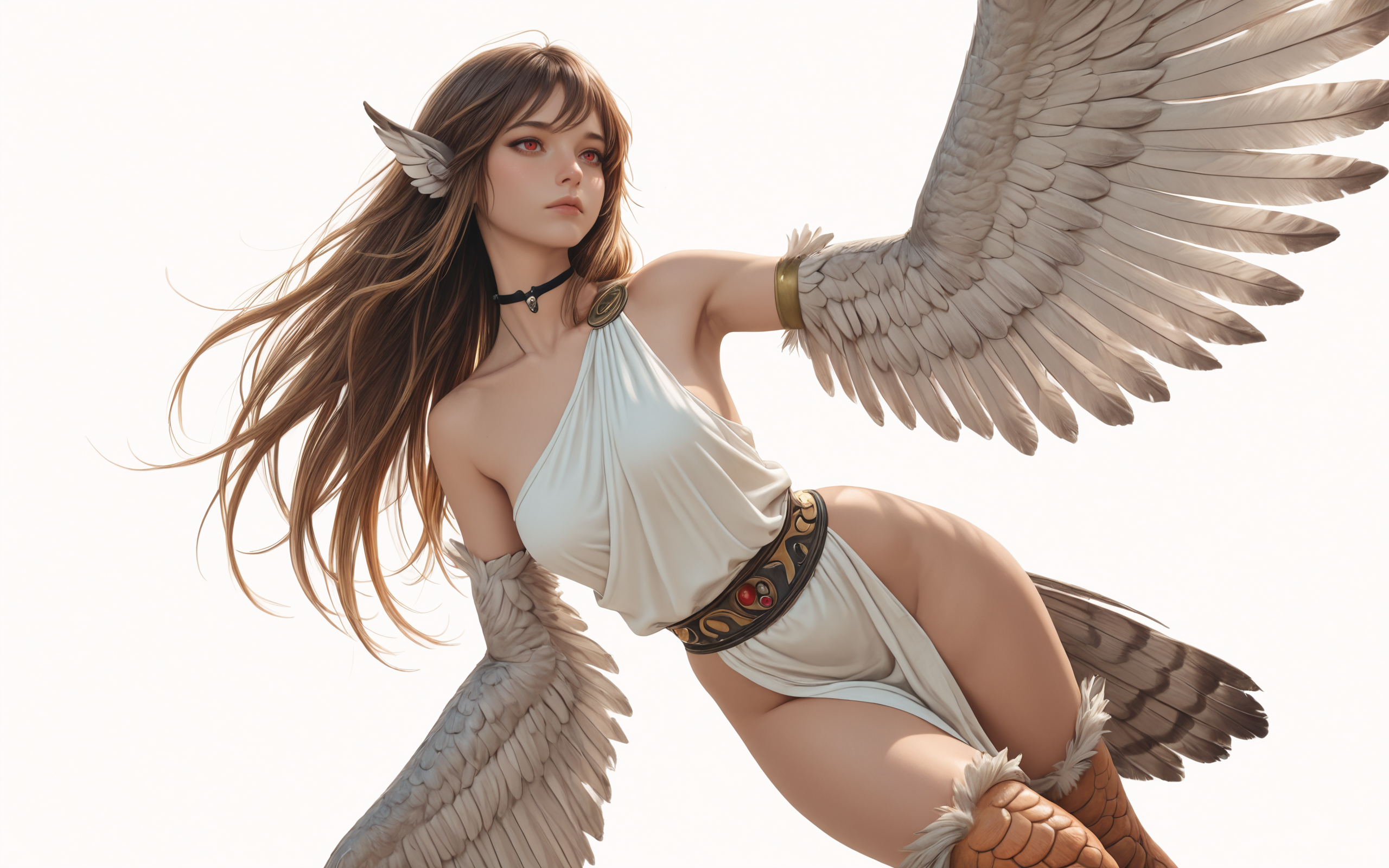 >>1394146 anime harpy girl, monster girl, full body, feathered ears, bird ears, winged arms, крылоруки, гарпия, ancient greek clothes, long hair, white feathers, bird tail, bird legs, human torso and shoulders and hips, 1girl, visual novel asset, white background, корпус направлен на зрителя и влево, red eyes, feathered neck and chest, mourning dove harpy, перьевое тёмное кольцо на шее