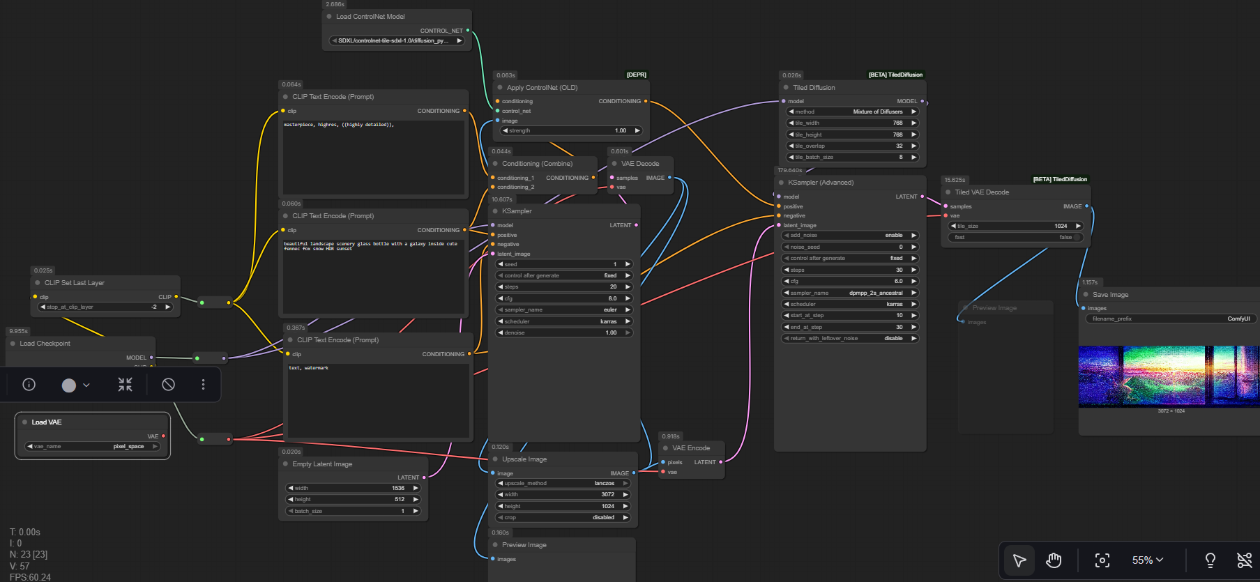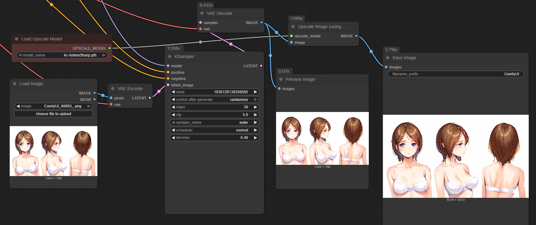>>1398615 >Аноны, а как вы апскейлите? Очень просто: из самплера подаешь LATENT в блок Upscale Latent, а оттуда во 2й самплер с той же моделью на шагов 8 с денойзом ~0.8