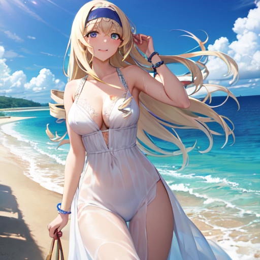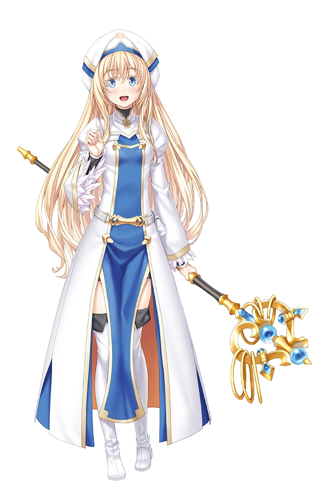 Priest: 5'2 ft, young girl with a delicate and frail build. Long blonde hair tied in braids, large bright blue eyes. Gentle face features. Porcelain and smooth skin. Slender build with minimal muscle definition, feminine, with a slim waist and small breasts. White-and-blue priestess robe adorned with golden trim, along with a small circlet on her head. Carries a staff engraved with holy symbols. Prayer book and rosary beads.