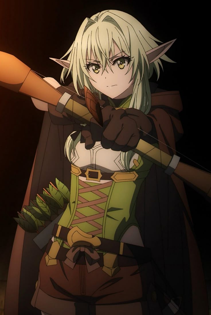 Archer: 5'4 ft tall, slender, lean athletic build. Her body is lithe and toned, featuring long, elegant legs, a narrow waist, and subtle curves that emphasize her agility over raw strength. Small, perky bust, smooth, flawless pale skin. Long, pointed ears poke through her vibrant green hair, which is styled short in the front and long in the back, with two delicate braids framing her face. Her eyes are sharp and emerald green