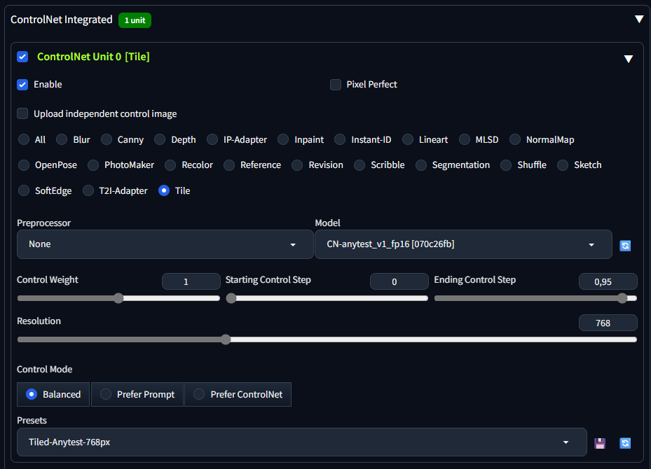 Все настройки и промпт точно такие же как и при генерации лоурез картинки. Ну разве что для лоурез генерации я использовал ControlNet Depth, а для апскейла - нет.