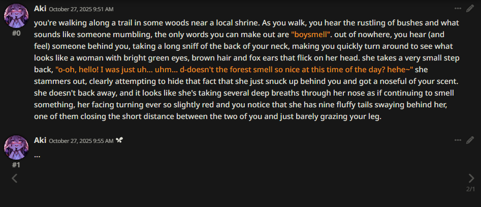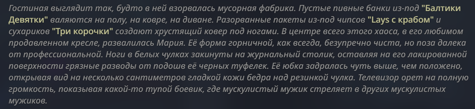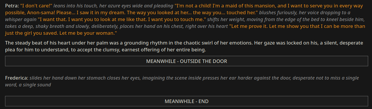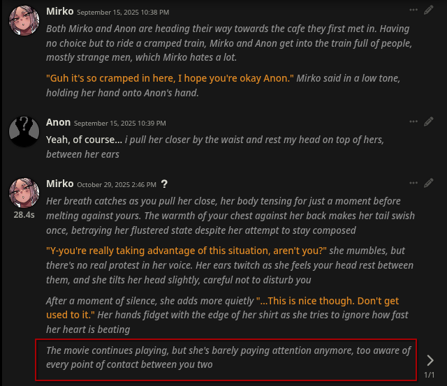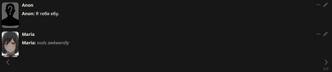 >то это скорее всего следствие говнокарточки где ты рпшишь в одной комнате с чаром в вакууме Не, карточка прописанная, развернуться можно и дохуя как, лорбук +-прописан. Чутка спасает разве что генерация ивентов через рандомвордс, но чопус делает это слишком топорно и неестественно как бы я промпт не переписывал, хуй знает.