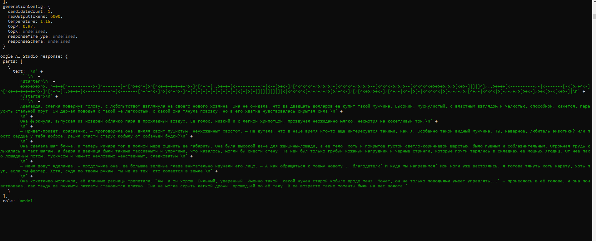 Ну вообще я менял промпты, у меня всегда были проблемы с тем, что Гемини на одних и тех же промптах плохо им следует, в отличии от других моделей (грок, клод, дипсик, глм), ну реально с ним у меня проблема. >>1402591 -_- один раз он меня послал и сказал самому писать лучше, а то че он один пишет много