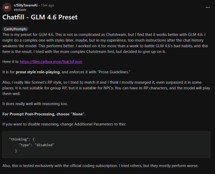 >>1403012 Релизная Гемини основная, иногда Соннет 3.7. Дипсик пробовал, вроде нормально, но не зацепил, может пресет был не очень. Чопус не могу назвать Опусом, какой-то большой Соннет, не особо зашёл, 4.1 просто калл. Сейчас пробую Соннет 4.5, разбираюсь с ним. Для ГЛМ есть пресеты на Реддите, недавно кидали один и подозреваю, что универсальные пресеты под китайцев подойдут и для него.