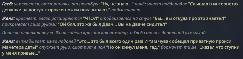 >>1401556 >про то что посрать сходить в провати чё не написал Ну это база любого рп, про такое как-то даже упоминать стыдно - все и так знают, все и так в курсе.