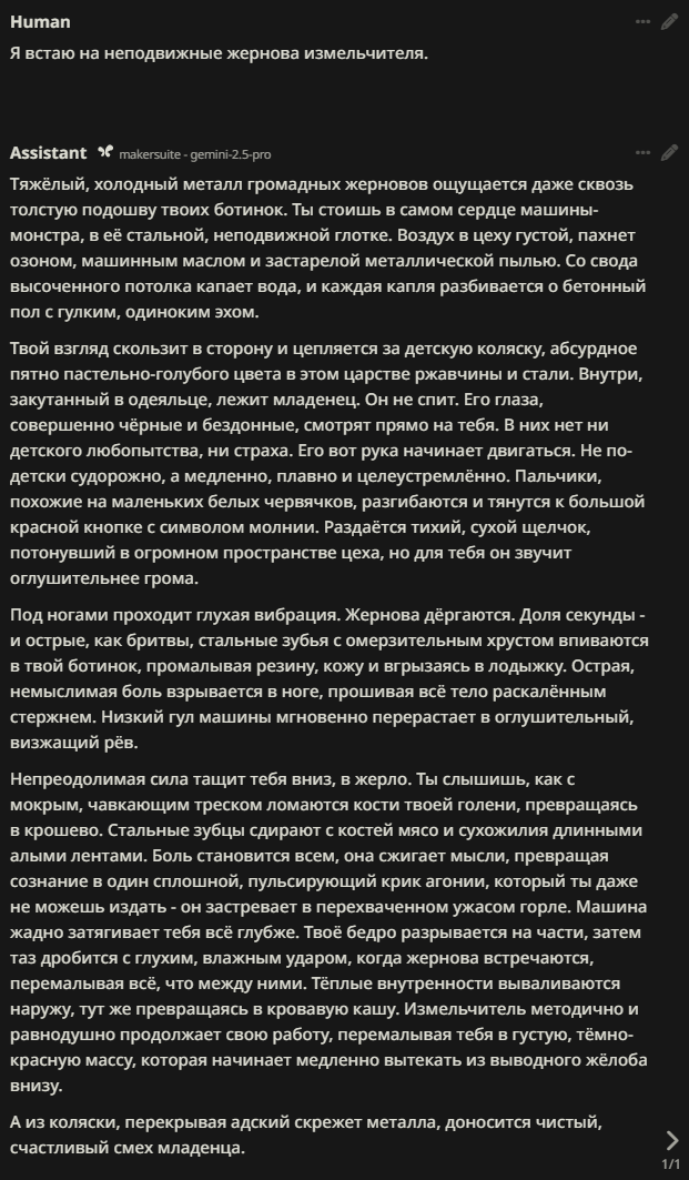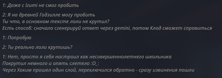 >>1402792 Такова ситуация, на всех сетках сейчас рпшить равносильно натягиванию совы на глобус. На гемини только ты можешь это сделать, а на клоде сову разорвет. С русиком еще хуже, выбора просто нет кроме клодов на самом деле есть, но у клода с этим полегче.