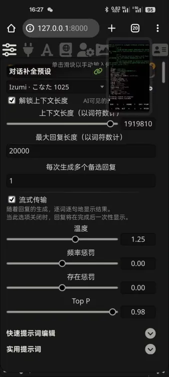 >>1400709 Я про вебку, я же не долбаёб копаться там где-то и чё-то искать ещё. Рпшу прямо на сайте и свайпаю по 500к контекста. Вы так сможете на ваших прокси?