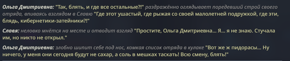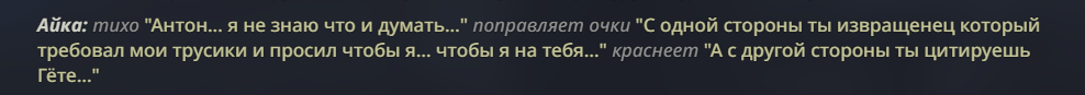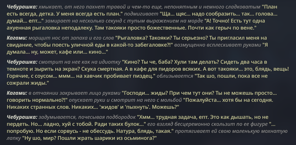 >протёк пример диалога в РП >залез в думалку >Мне сказали что не следует использовать примеры диалога слово-в-слово... Но тут такая хорошая ситуация, так что чуть-чуть можно.