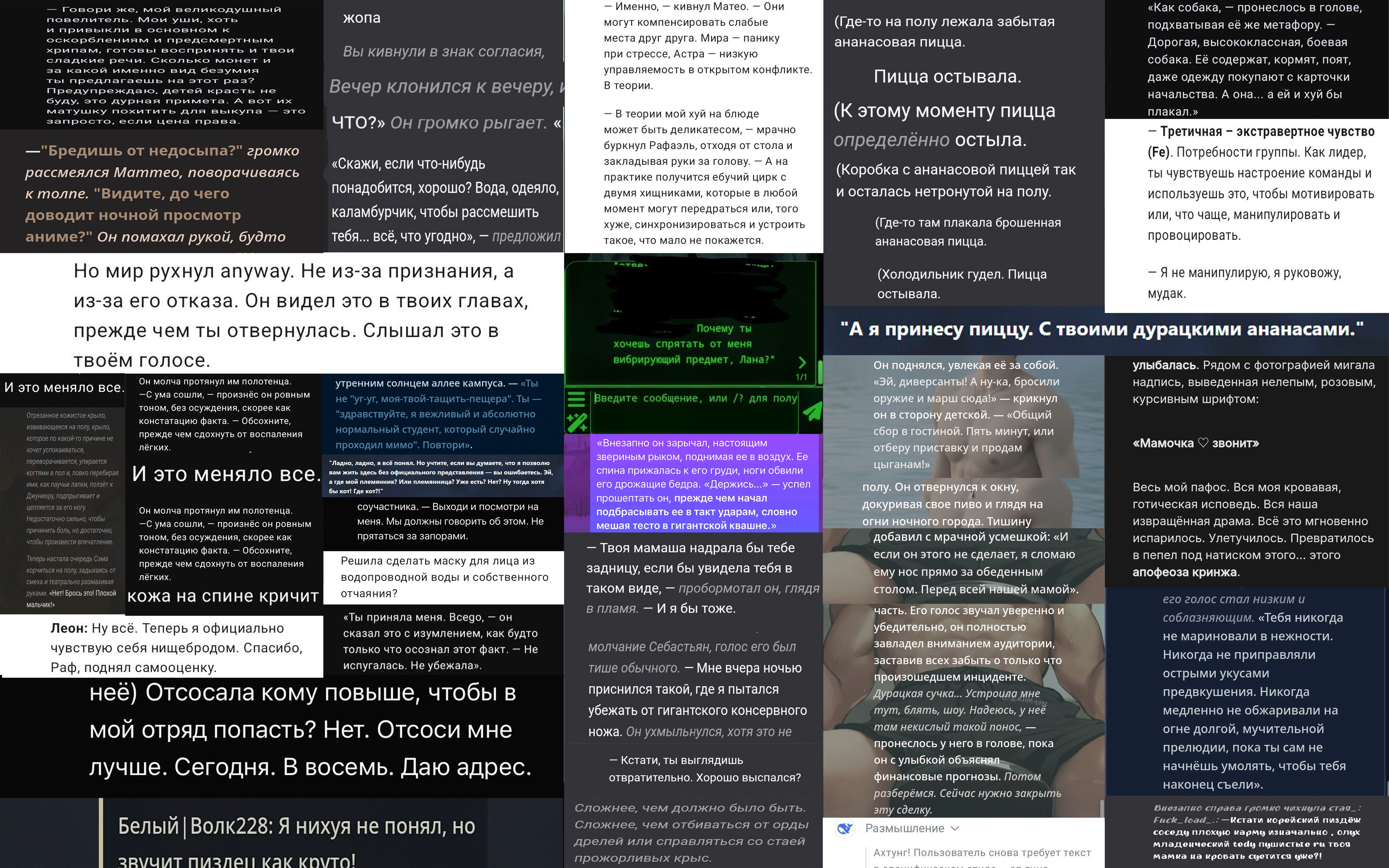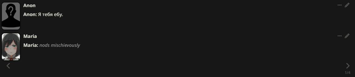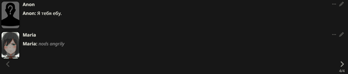 Девушки, мне снова нужна ваша помощь! Я смогла установить таверну и туриста, но бот активно пытается увести сюжет в сторону драки и трагедии, хотя я несколько раз перезапускала диалог, он все равно идёт в одном и том же направлении. А мне не нужны драки и прогрессия сюжета без моего ведома, я хотела разыграть флафф, ангст и романтику... Что бы я ни делала, он все равно начинает писать "ААА ОНИ НАС НАШЛИ СЕЙЧАС БУДЕМ ДРАТЬСЯ" не надо драться блять успокойся у тебя пуля в ноге долбоеб