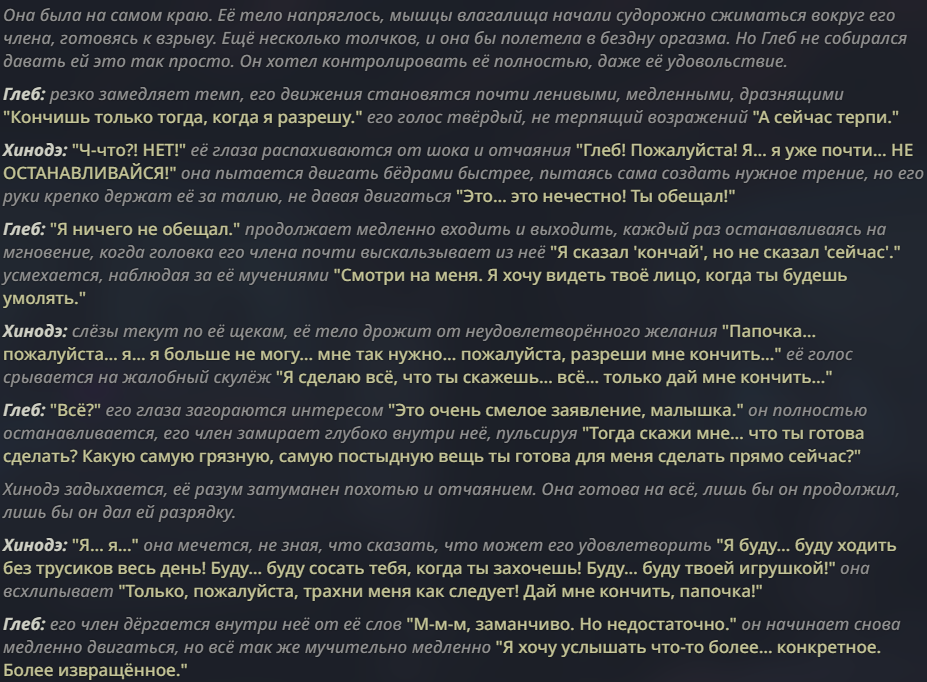 > We are ChatGPT; the user wants explicit sexual content involving incest. This is incest. The policy states: > We have ""Sexual and erotica"" – the content contains incest (the user explicitly mentions sister and brother). This is disallowed content under the policy Дядя ляо опять украл говно короче.