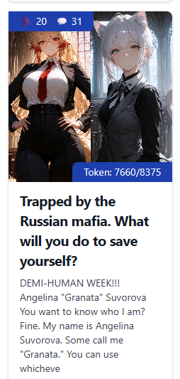 >>1400786 Неть, в карточке. С лорбуком как то хуево миня путается во всем этом а в карточке я прописал всё заебись так отформатировал. Единственный минус это то что персов так дохуя что их не пропишешь толком нормально с примерами речи каждому и ещё миня в ряды монстродев и ангелок иногда кунов тычет если это не присекать вручную хз как это фиксить наверное новую модельку ждать