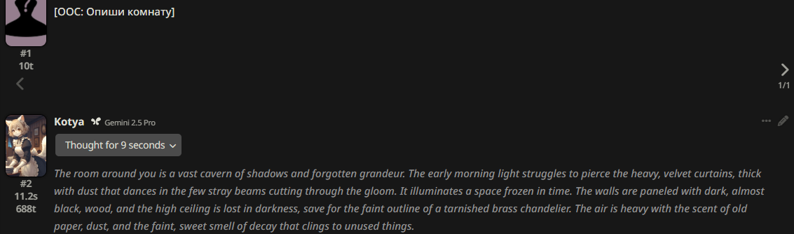 Единственный плюс: у гемини отличный русский, но я всегда рпшу на английском, так что мне это не очень важно. Ну и гемини знает много сеттингов, что очень интересно, но всё вышеперечисленное нивилирует эти плюсы.