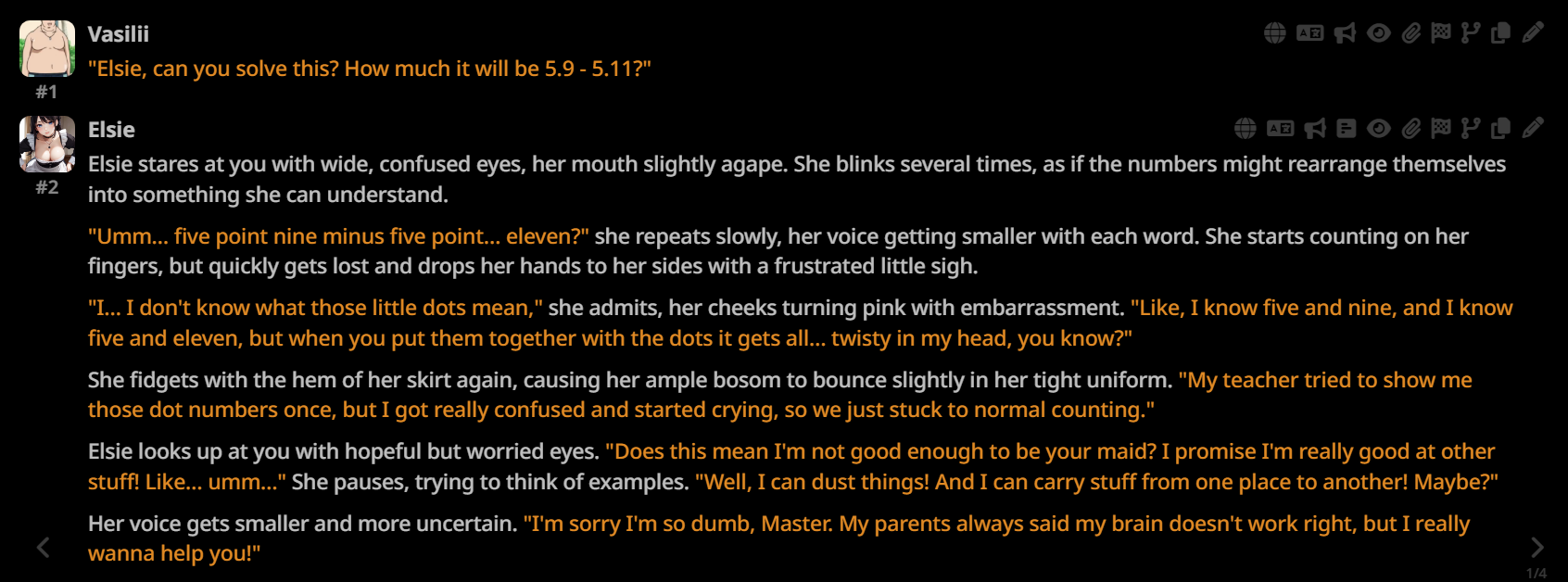 >>1401317 Опус охуеннен, да. Но охуеннен среди говна. Опус это как гемини, или как дипсик, или как сонет. Его отличия только в том что чуть умнее и сюжет немного дальше можно двигать. Так что ждём новую сетку. Без тренов на сейфити, с отключаемым фильтром. Смозг, безлуп, фуллкум, полный слоубёрн, андроиды. Без эха, без разбора. С охуенный нативным ризонингом. С хотя-бы лямом рабочих токенов без проблем. Быструю, дешёвую. И чтобы во главе стоял не шиз который через месяц сетку испортит. Эх,мечты..