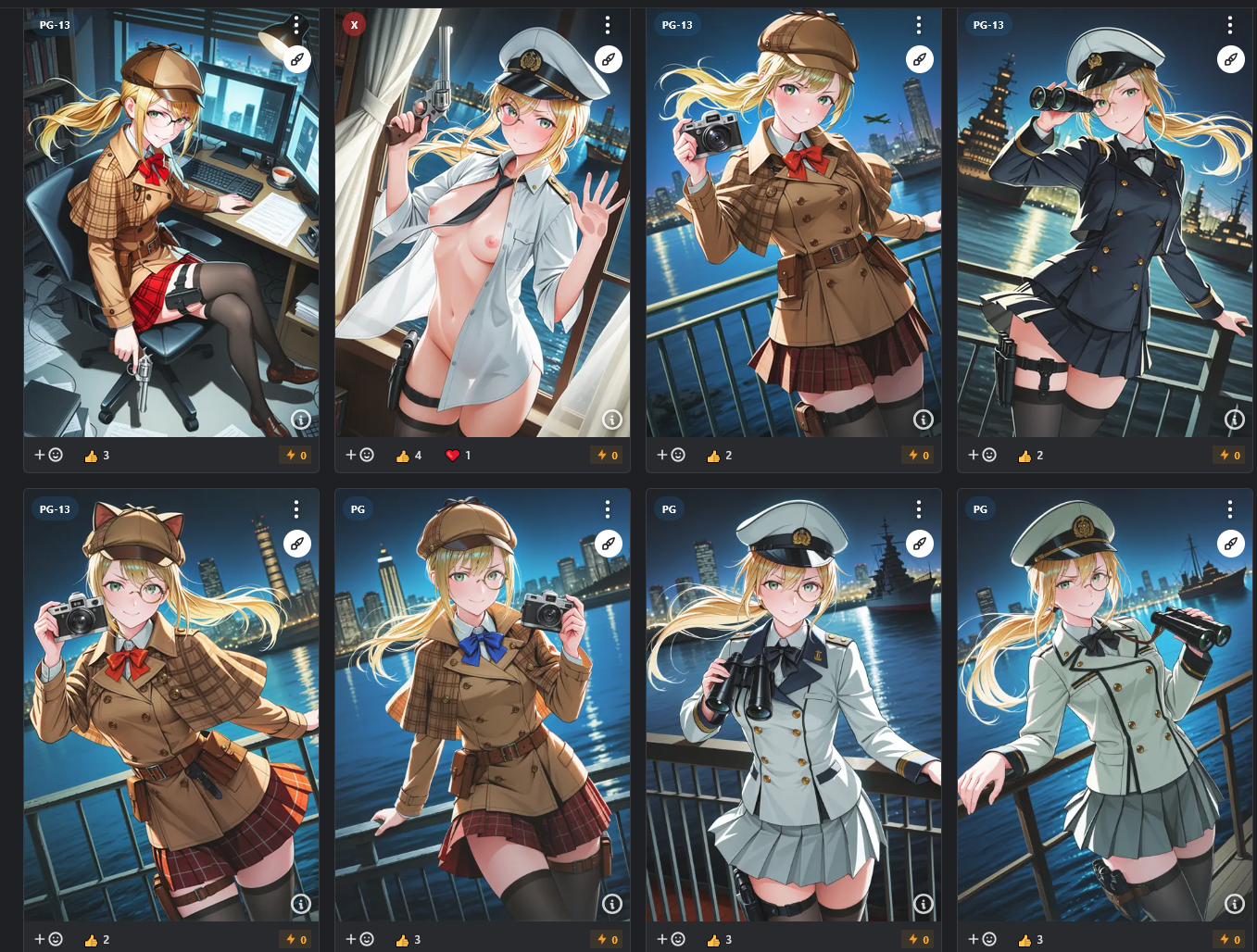 >>1416607 Этот >>1416611 прав, вообще никакой разницы в картинках, однообразие пиздец, даже поза не меняется, максимум фон иногда. Вон, посмотри на лисогенераторов, у них каждая картинка - новая ситуация, то за мышами охотятся, то комп собирают, то ещё какая забавная ситуация, а у тебя тупо ван герл стендинг, голландский угол, +- ещё 3 промпта, может в году 2022 это и можно было хавать, но на дворе конец 2025, люди уже с картинок во всю на видео переходят, а у тебя как были однообразные картинки, так такими и остались. Если честно я по началу думал что это вайп. Уж прости, но это пиздец.