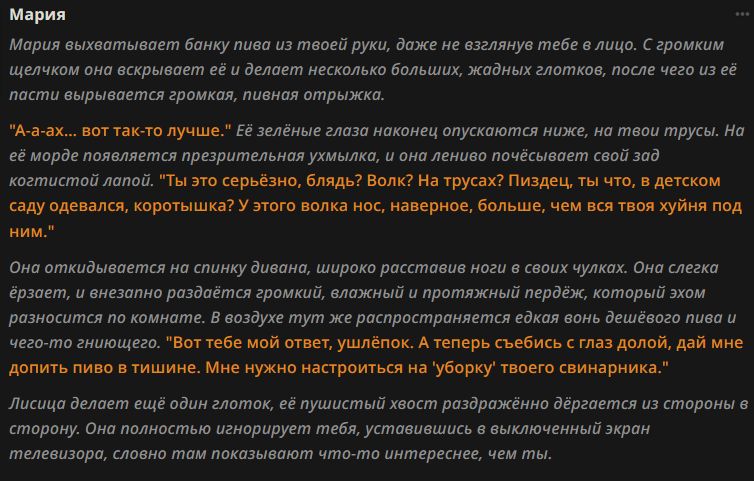 >>1406460 >Я просто хочу оутпут уровня >"Вы зашли в комнату, там стул, стол, мешок картошки и бандос, ваши действия: >1)Сесть на стул >2)Обыскать мешок >3)Рассказать бандосу анекдот" Так ты промптить-то пробовал, вась? Примеры как правильно делать сетке дай. CYOA хмылка или его адаптацию под гемини возьми, там всё это есть. Трекеры стат, всё вот это. А вообще автосгенерированный CYOA это хуёвый способ РПшить как по мне, потому что ты нихуя информации не сообщаешь модельке и ползаешь по её стереотипам. Но это личное мнение >Когда беру какой-нибудь дипсик у меня даже не получается модельку заставить во втором лице ко мне обращаться, хотя всякие пресеты я ставил и рычажки дёрнул. Какой-то лютый скилл ишью. Тебе надо не пресеты ставить, а самому разобраться как промптить.