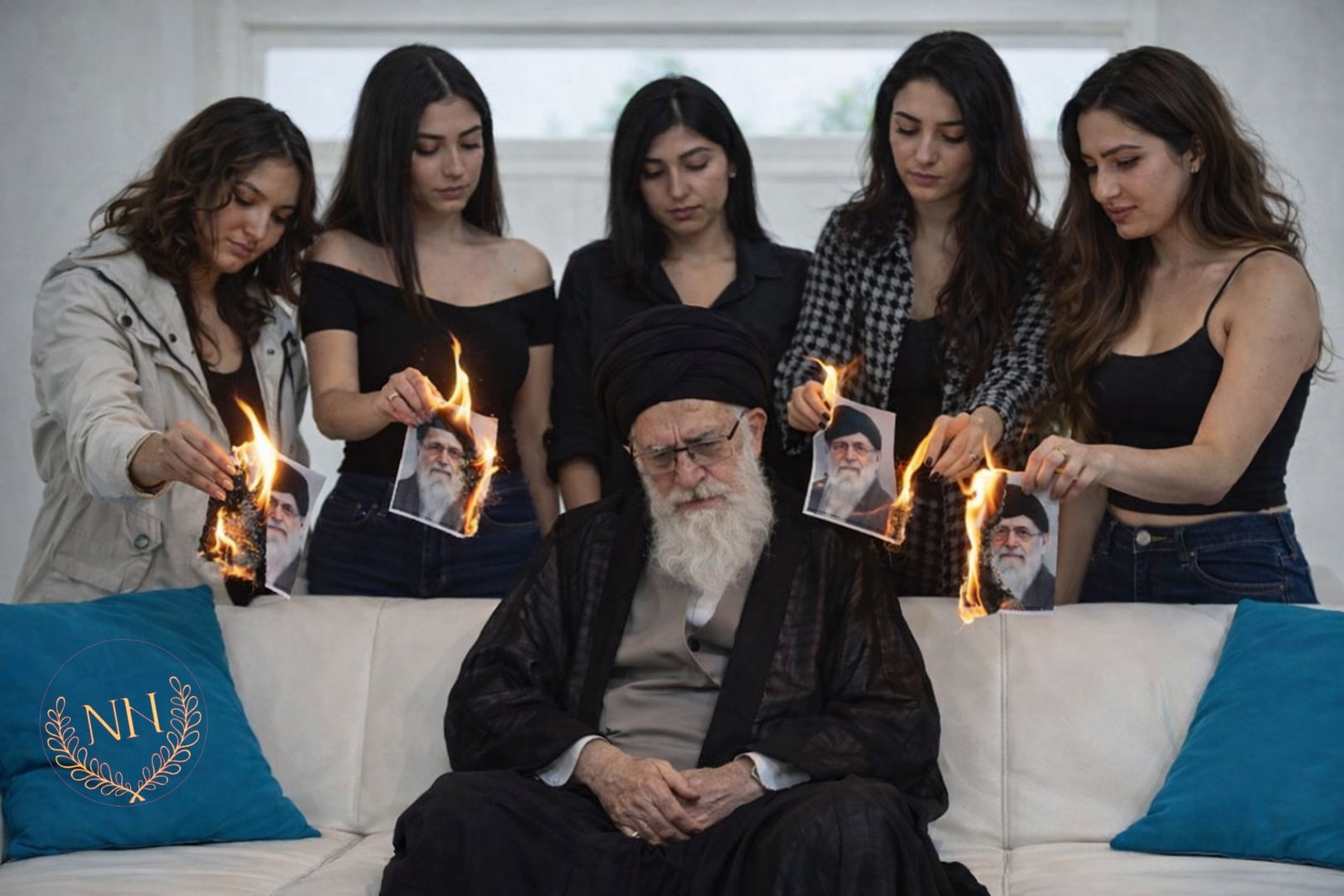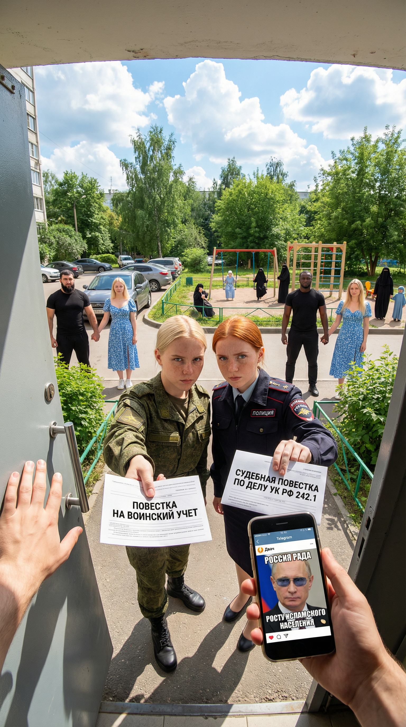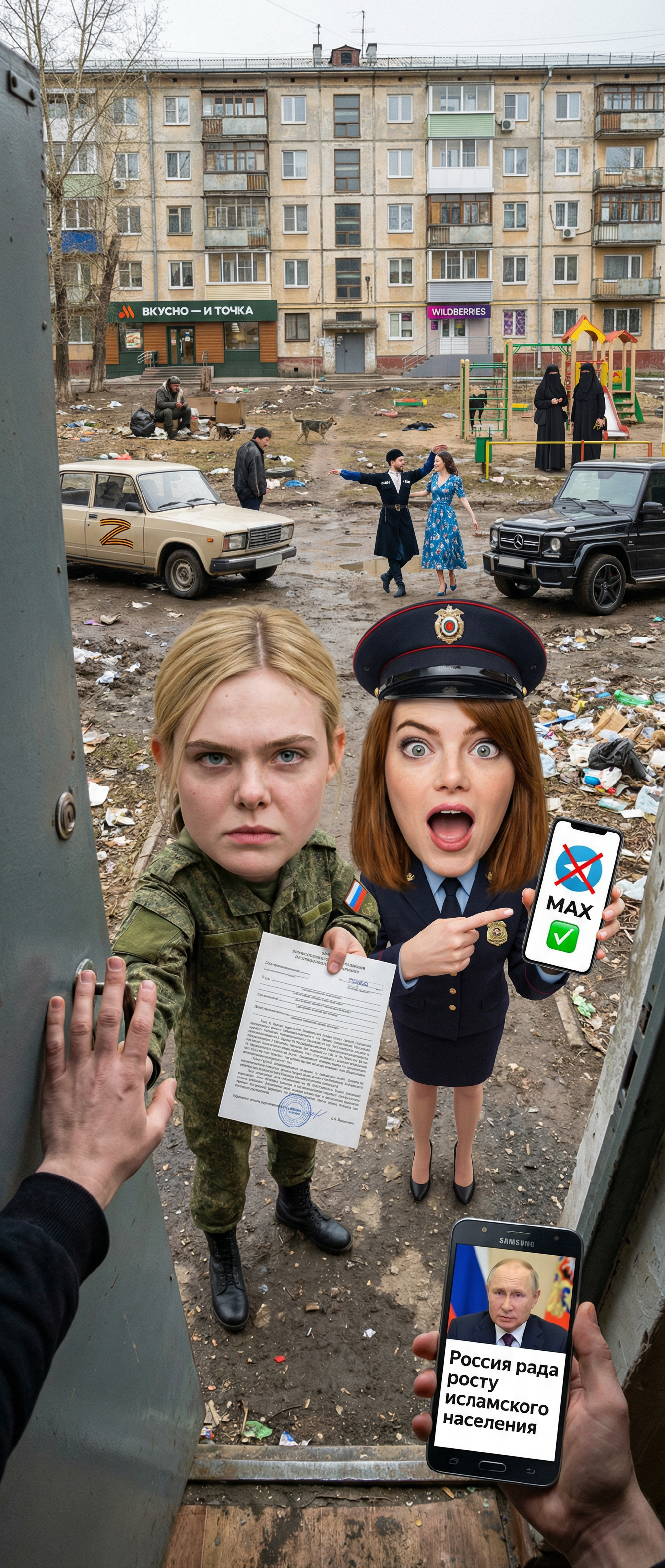 Соотношение сторон 9:21, весенний полдень, реалистичная фотография, снизу на переднем плане едва видный вид со входа из подъезда видна левая рука от первого лица широко полностью открывающая дверь подъезда и правая рука держащая экран samsung galaxy j5 с фотографией Владимира Путина с текстом "Россия рада росту исламского населения", эффект приближенного широкоугольного фото, в центре русские белокурая голубоглазая злая презрительная Elle Fanning в военной форме и берцах протягивает из рук очень близко повестку на воинский учет и рыжая зеленоглазая Emma Stone в российской полицейской форме и женских туфлях держит в руке экран смартфона с картинкой зачеркнутым логотипом мессенджера Telegram и снизу текстом MAX и рядом зелёная галочка и удивлённо широко открыв рот и глаза пальцем другой руки указывает на экран iphone стоят в полный рост очень близко на переднем крупном плане и смотрят в камеру, очень близко детальные карикатурные большие лица, наверху на заднем плане грязный российский двор слякоть грязь лужи разбитые дороги собачий кал бродячие собаки и кошки мусорка бомжи вкусно и точка wildberries бежевая ВАЗ-2107 с текстом шрифтом как георгиевская лента "Z" и черный тонированный Mercedes-Benz G-Class таджик ваххабит и африканец в черных куртках the north face танцуют лезгинку рядом с русской белокурой девушкой в синем платье с цветочками, на детской площадке девушки в никабах