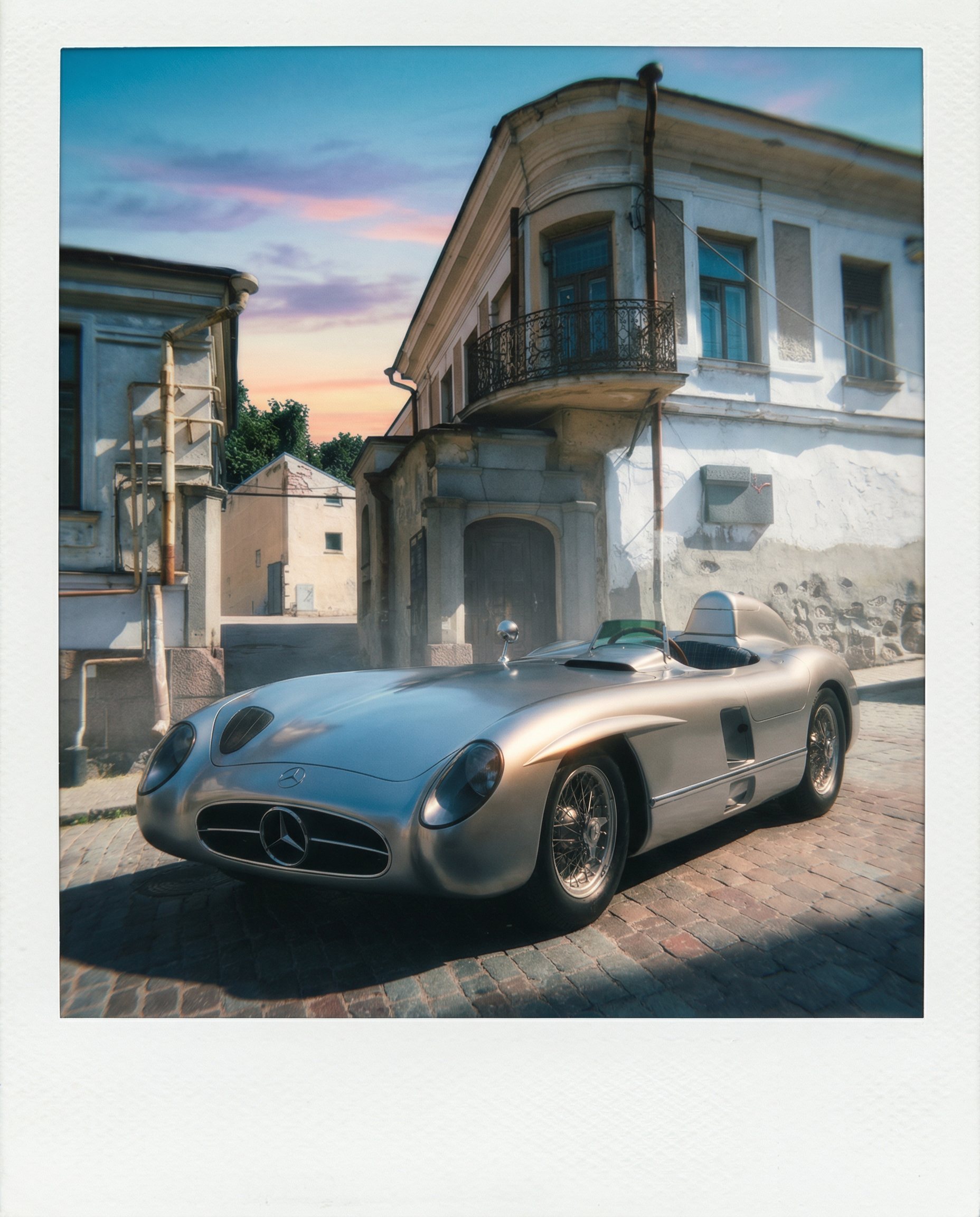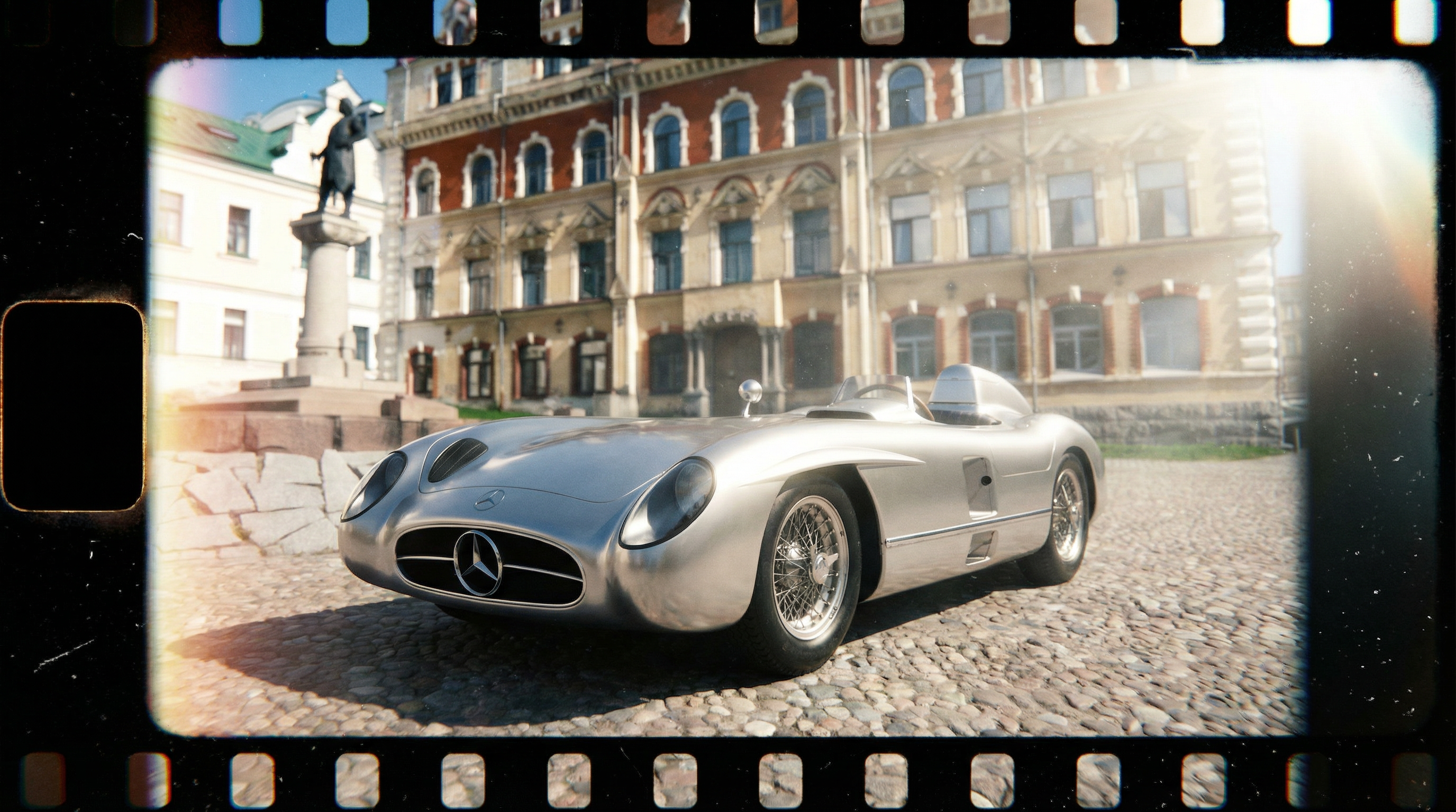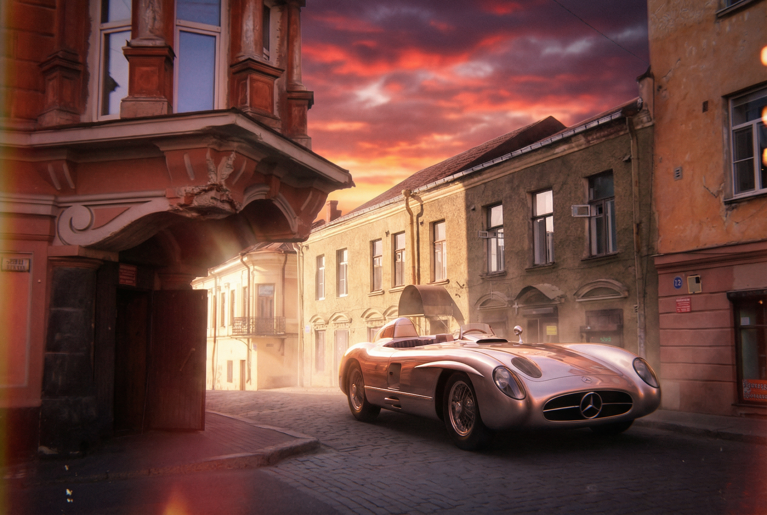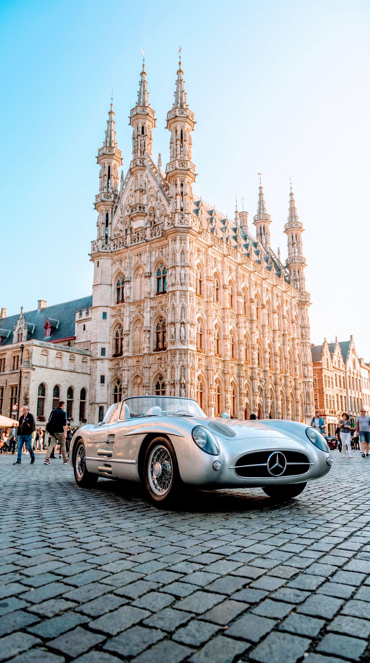 Create sunny below view image with 9:16 aspect ratio of 1959 mercedes-benz 300 slr and leuven town hall