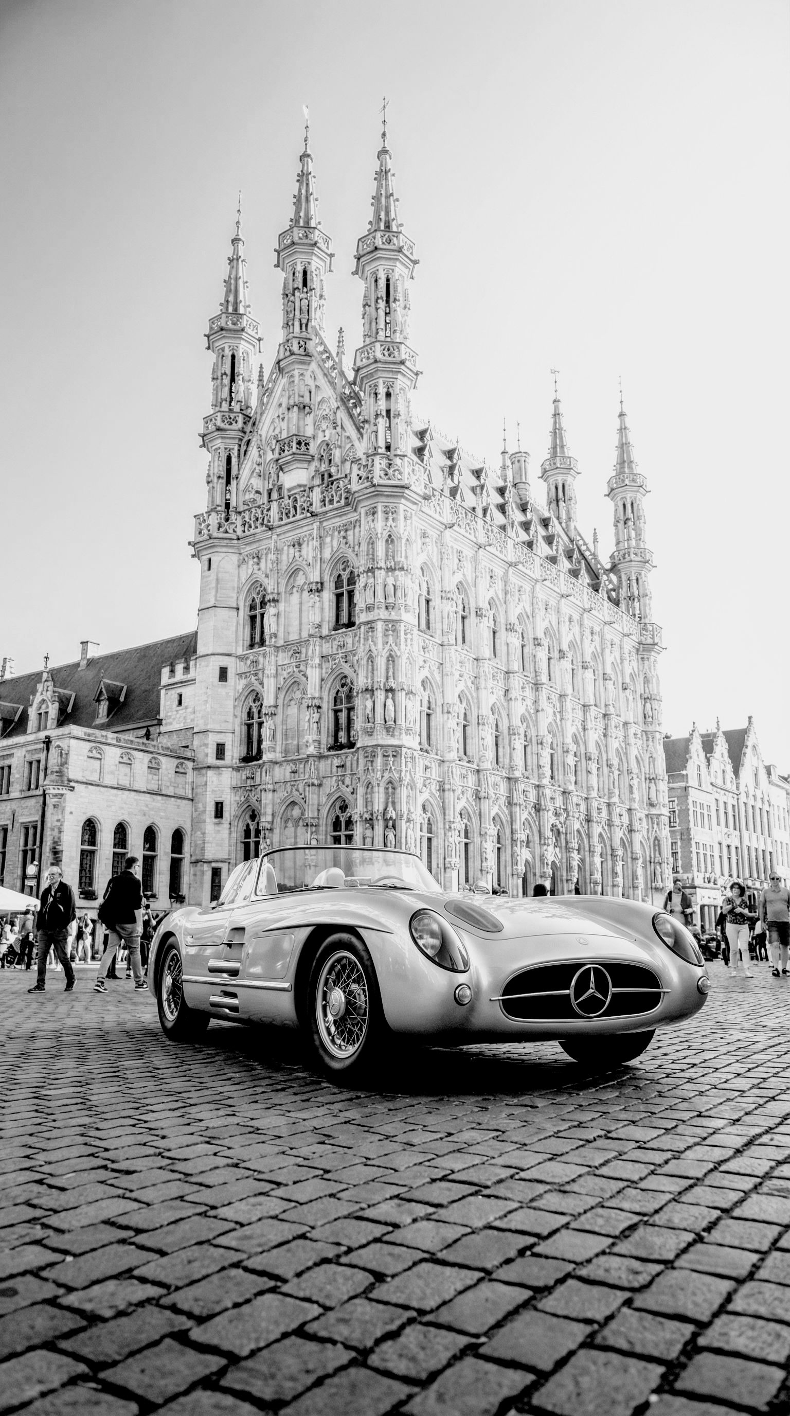 Create sunny below view black and white image with 9:16 aspect ratio of 1959 mercedes-benz 300 slr and leuven town hall