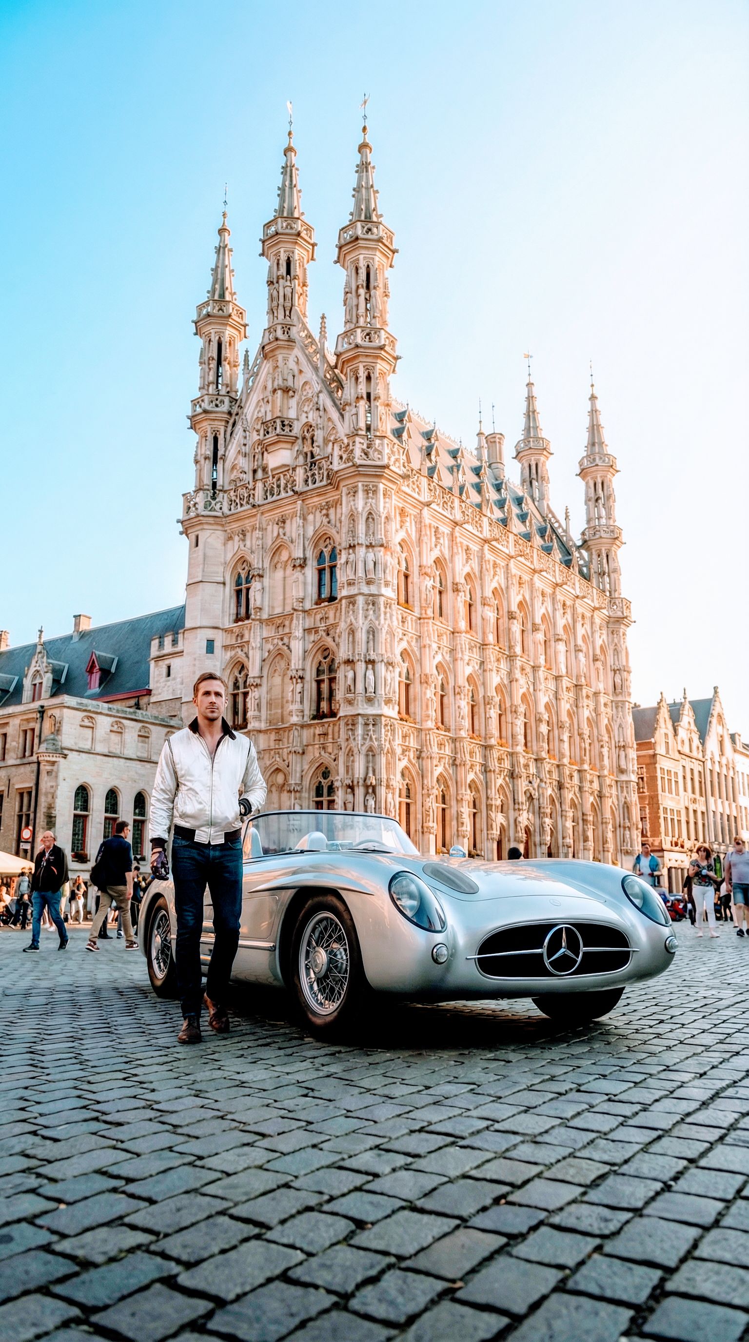 Create sunny below view image with 9:16 aspect ratio of ryan gosling from drive movie stand near by 1959 mercedes-benz 300 slr and leuven town hall