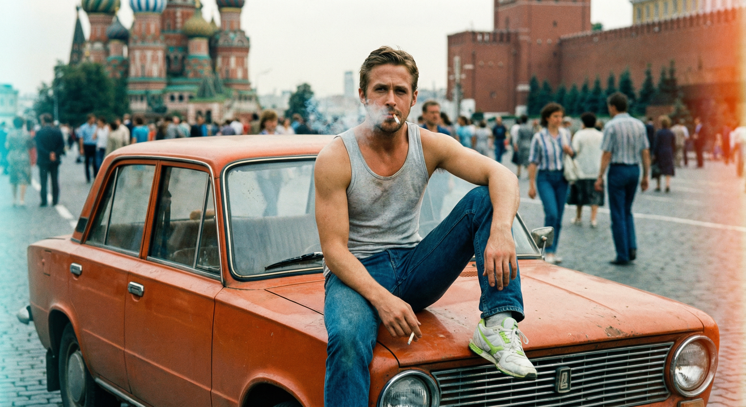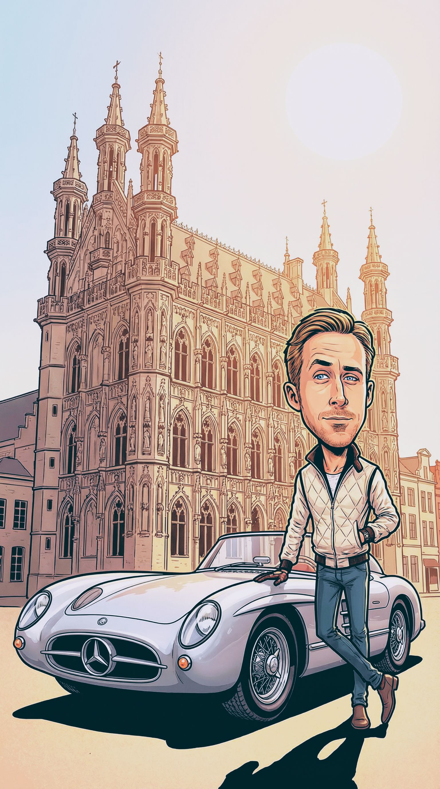 Create sunny below view caricature pin-up image with 9:16 aspect ratio of ryan gosling from drive movie stand near by 1959 mercedes-benz 300 slr and leuven town hall