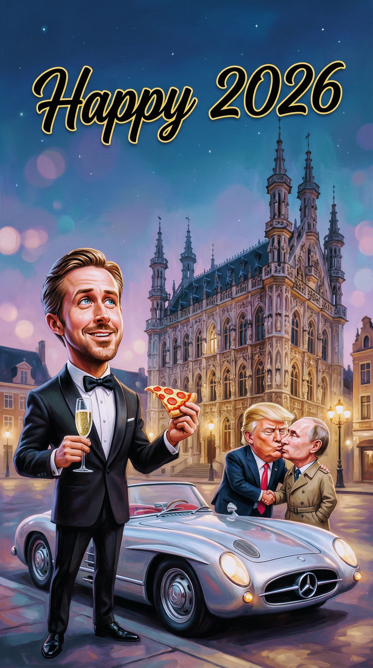 black script romantic text with yellow outline "Happy 2026", evening night below view very caricature pin-up cartoon close-up image with 9:16 aspect ratio of ryan gosling wearing 1950s hollywood costume holding champagne and tasty slice of cheese pizza stand with kissing donald trump and vladimir putin near by 1959 mercedes-benz 300 slr and leuven town hall, 8k, 4k, cinematic lighting, oil painting, brightness, contrast, sharpness, exposure, pastel tone, depth of field, retouch, hdr, lightroom, masterpiece, best quality, aesthetic, perfect composition, intricate details, film grain, moody, shadows, vibrant, colorful, bokeh, reflections, studio light, telephoto lens
