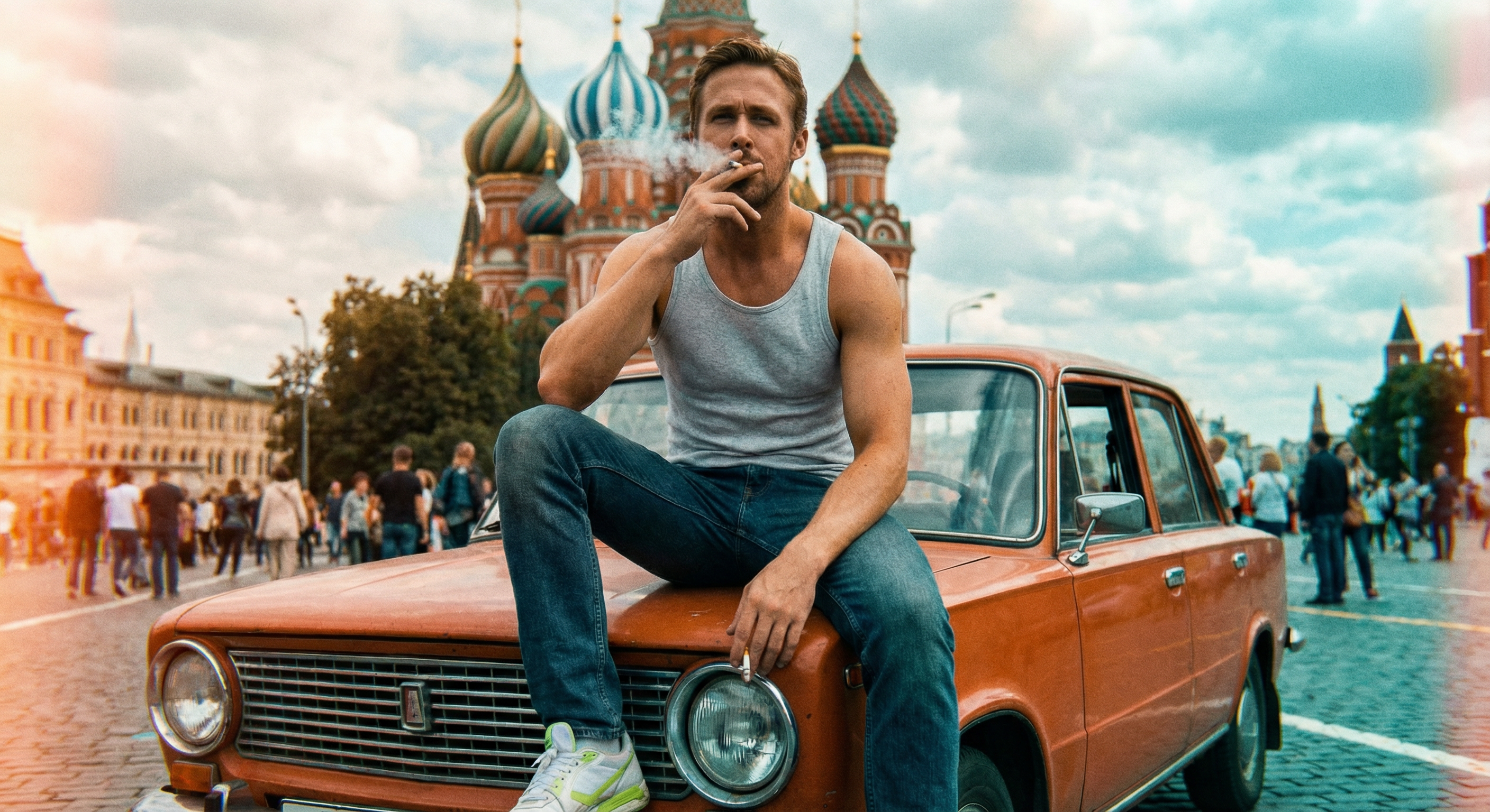 detailed close-up cinematic sunny photo with 16:9 aspect ratio, family portrait, detailed close-up smiling ryan gosling face wearing gucci jacket with diamond grillz and diamond watches holding bottle of добрый кола and вкусно и точка кидз комбо, detailed close-up smiling donald trump face wearing louis vuitton jacket and emo hairstyle holding cheburashka plush toy, emma stone face, elle fanning face, anya taylor-joy face, margaret qualley face, sadie sink face, sophia lillis face, margot robbie face, emma watson face, sydney sweeney face, billie eilish face, outside московский вокзал from площадь восстания