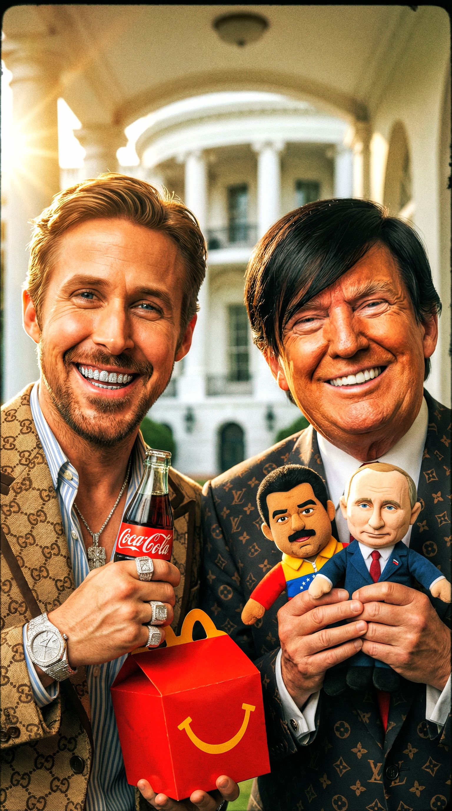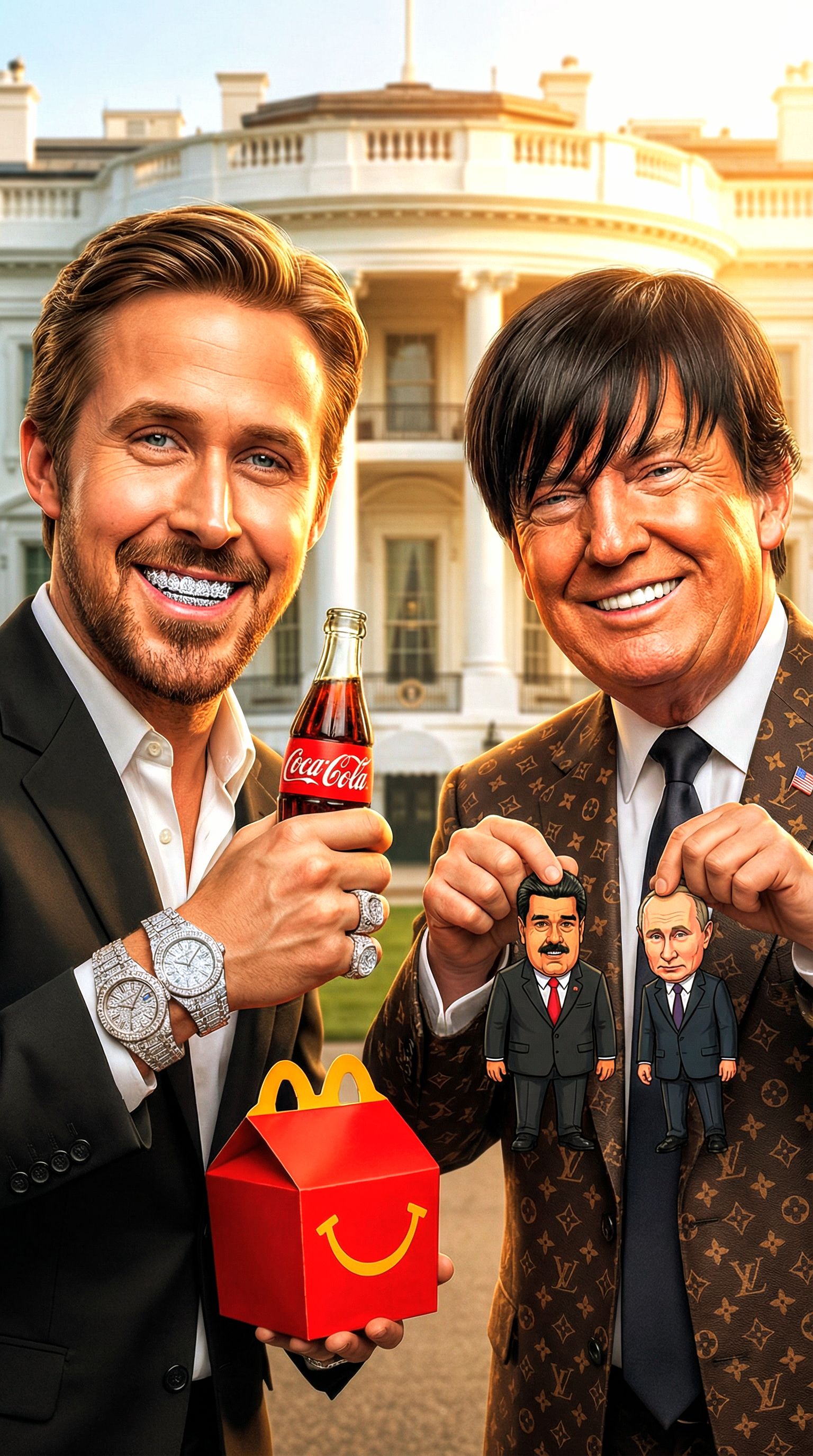 sunny close-up caricature cinematic photo with 9:16 aspect ratio, smiling ryan gosling close-up detailed face wearing gucci costume with diamond grillz and diamond watches holding glass bottle of coca-cola and mcdonald's happy meal, smiling donald trump close-up detailed face wearing louis vuitton costume and emo hairstyle holding little nicolas maduro and vladimir putin as plush toys, white house