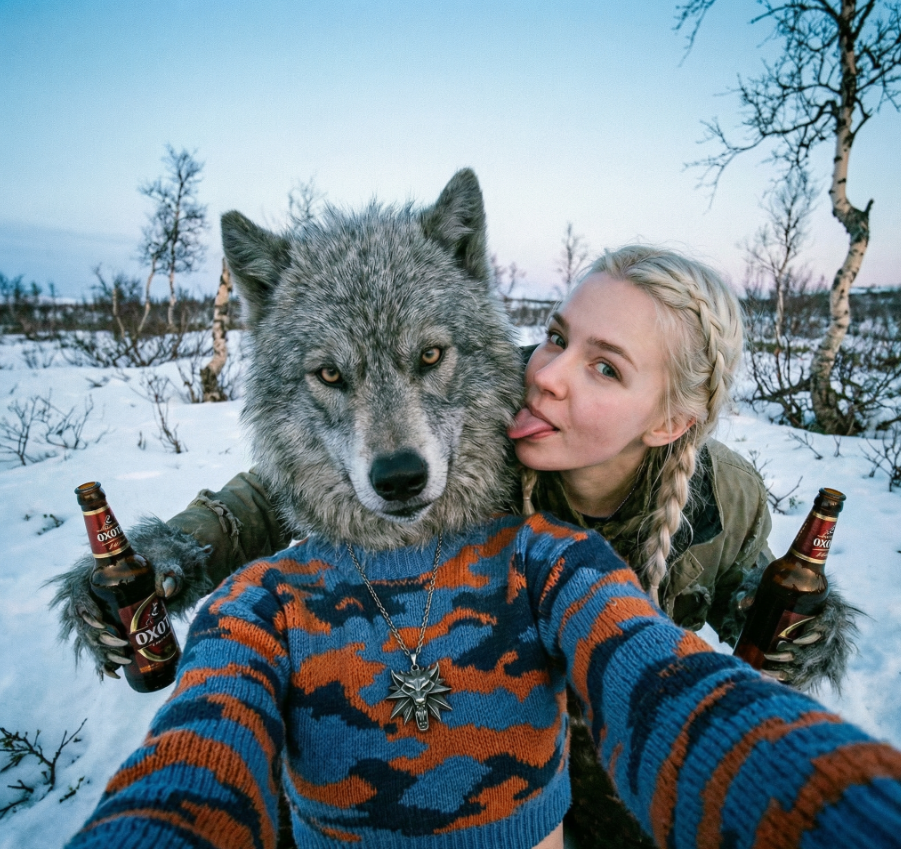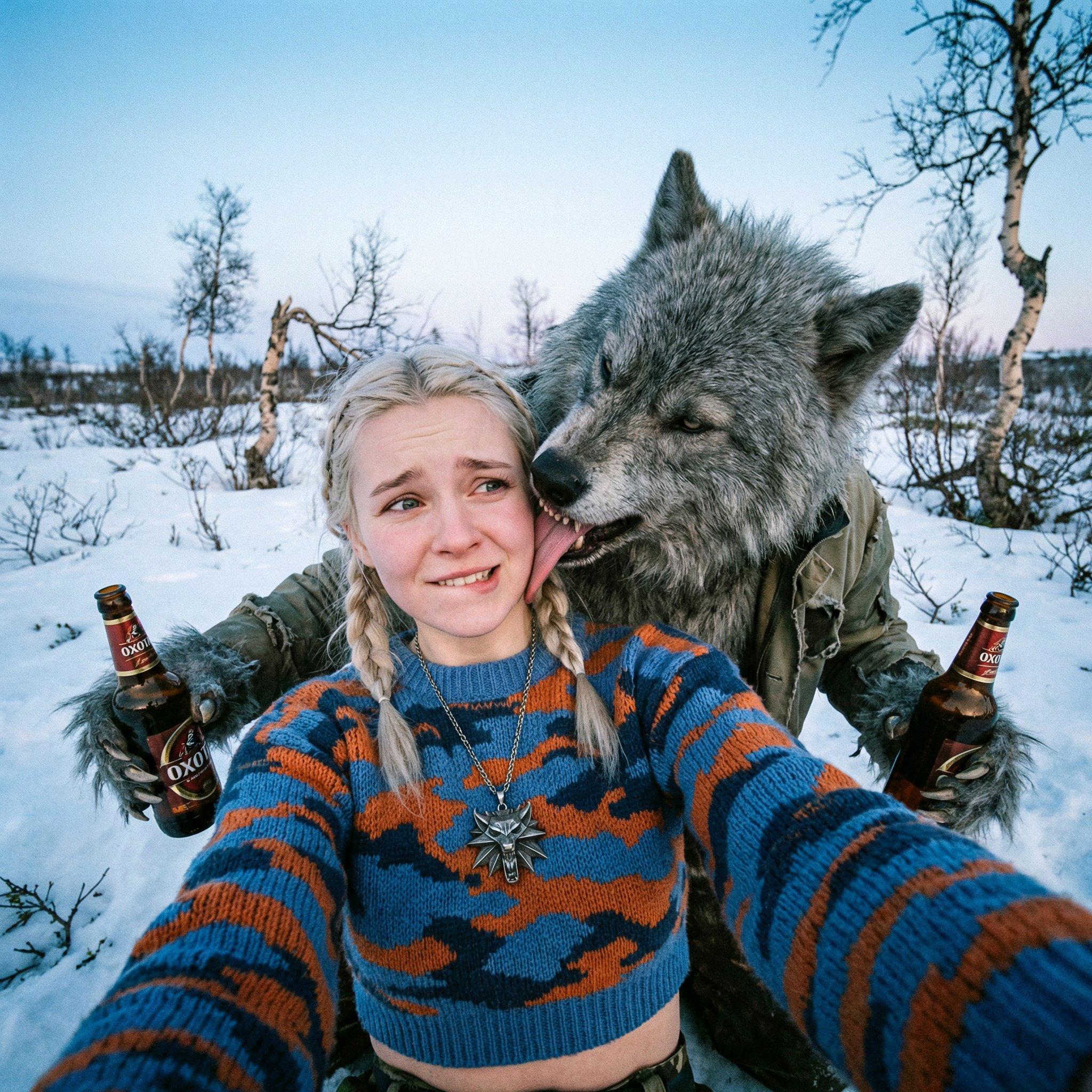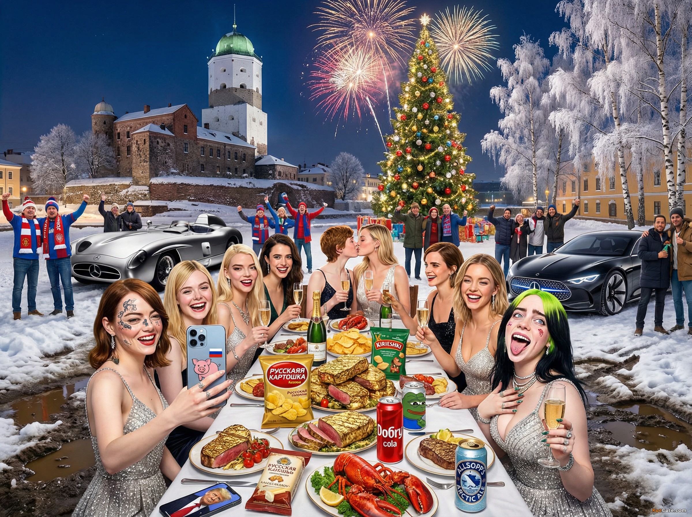 Ночь, зима, снег, iphone фото, салют, 4:3, вид снизу, близко, портрет, веселятся и отдыхают на застолье, держат в руках бокалы детского шампанского, на столе добрый cola и пиво Allsopp's Arctic Ale и кириешки и омары и стейки покрытые золотом и чипсы русская картошка со вкусом сметана и зелень, и сырок б.ю. Александров и айфоны 17 pro max с включенными экранами и мемами про Трампа и лягушонка Пепе в них, все актрисы одеты в бриллиантовые дорогие платья, emma stone face с ауе татуировками и elle fanning face держит в руках айфон с отчетливо видной картинкой свиньи держащей флаг России и подписью снизу картинки "Это ты" и anya taylor-joy face и margaret qualley face и sadie sink face и sophia lillis face целует margot robbie face и emma watson face и sydney sweeney face и billie eilish face показывает ахегао, выборг площадь старой ратуши, пушистые красивые берёзки и огромная наряженная ёлка, невероятно красивый красно-розовый закат с невероятно красивыми и красочными воздушными облаками, 1955 mercedes-benz 300 slr from uploaded photo и 2025 черный mercedes-benz vision iconic возле которых русские девушки блондинки Наташи футбольные болельщицы ЧМ 2018 держит в руках африканских детей и целуется с африканцами и таджиками и индийцами и китайцами, вкусно и точка, бездомные собаки одетые в фуфайки телогрейки, спящие пьяные русские бомжи на земле, хоббихорсеры прыгают сзади, Путин и Трамп показывают средний палец и стоят за пулеметом mg-42 из окна Выборгской старой ратуши, рядом с ними на балконе очень толстый русский скуф сидит спиной за компьютером где включена игра World of Tanks в майке с принтом флага России и заглавной буквы Z и обосранными штанами, лужи и грязь, разбитые дороги, Чикатило и Чарльз Мэнсон и Николас Кейдж из фильма воздушная тюрьма дают леденец красивой русской 10 лет девочке альбиносу, русские бабушки роятся в мусорных баках на которых нарисован текст "ОБАМА чмо ауе Трамп наш Саня лох" возле вкусно и точка