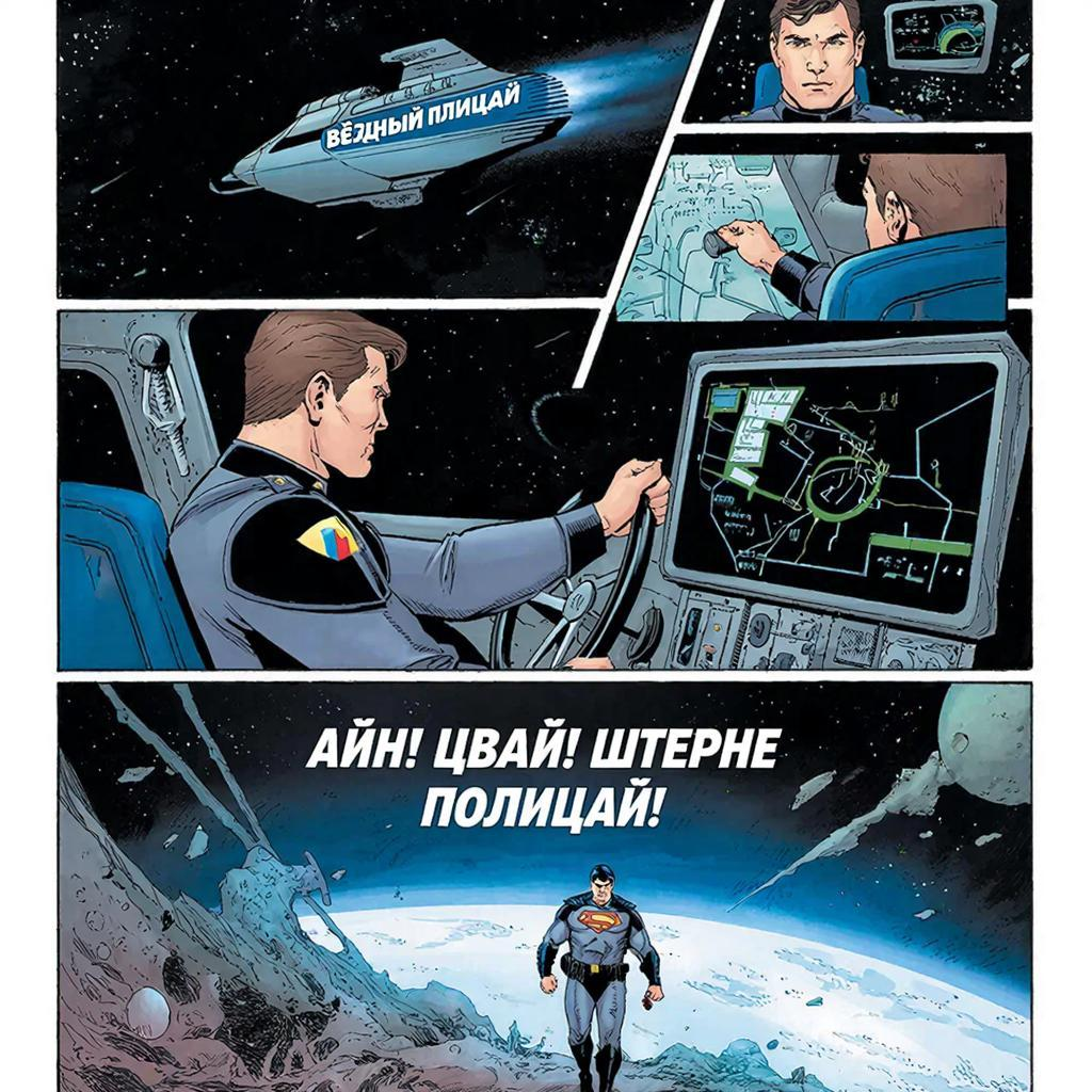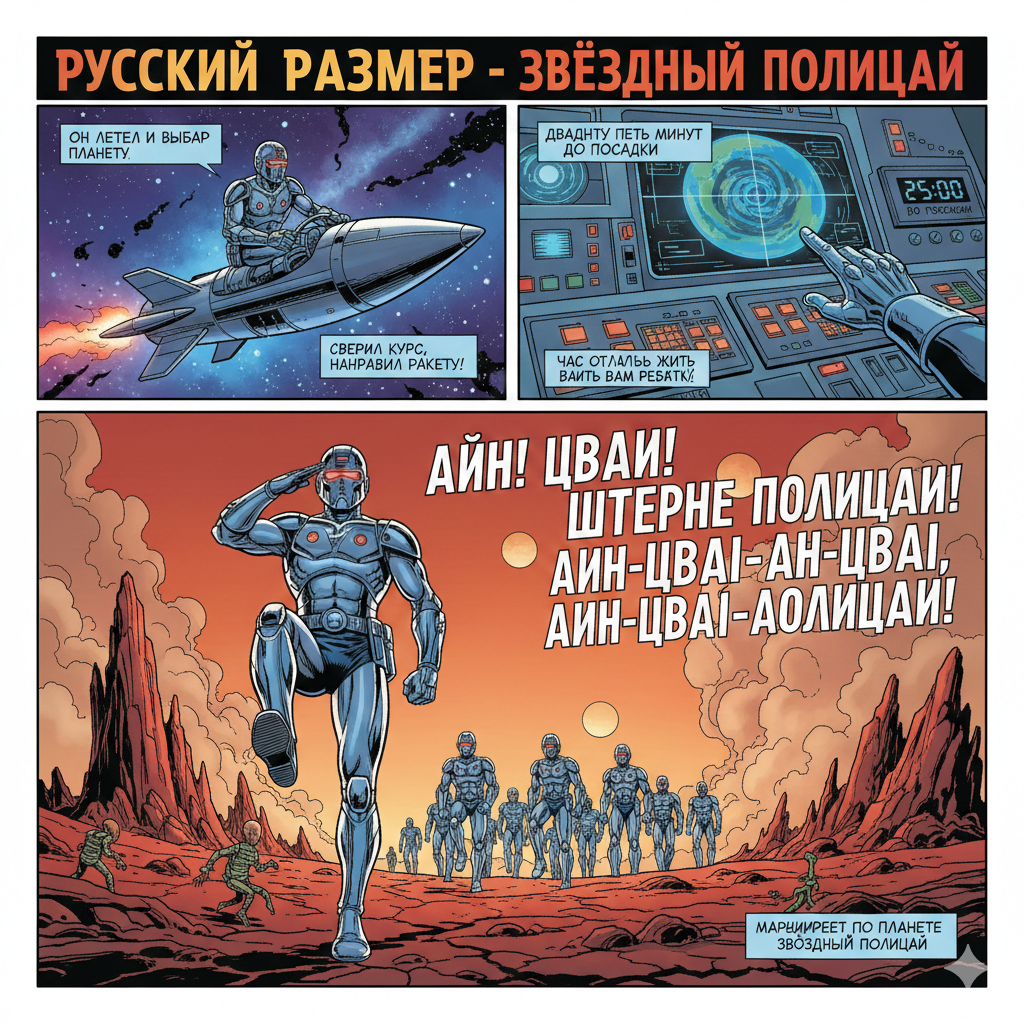 Сгенерируй комикс в 3 окна, два сверху, один большой снизу, он не должен быть слишком карикатурный, а как комиксы про Супермена или Бэтмена, по этому тексту: Руссикй Размер - Звёздный полицей [Куплет] Он летел и выбрал планету Сверил курс, направил ракету Двадцать пять минут до посадки Час осталось жить вам ребятки