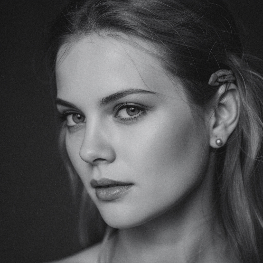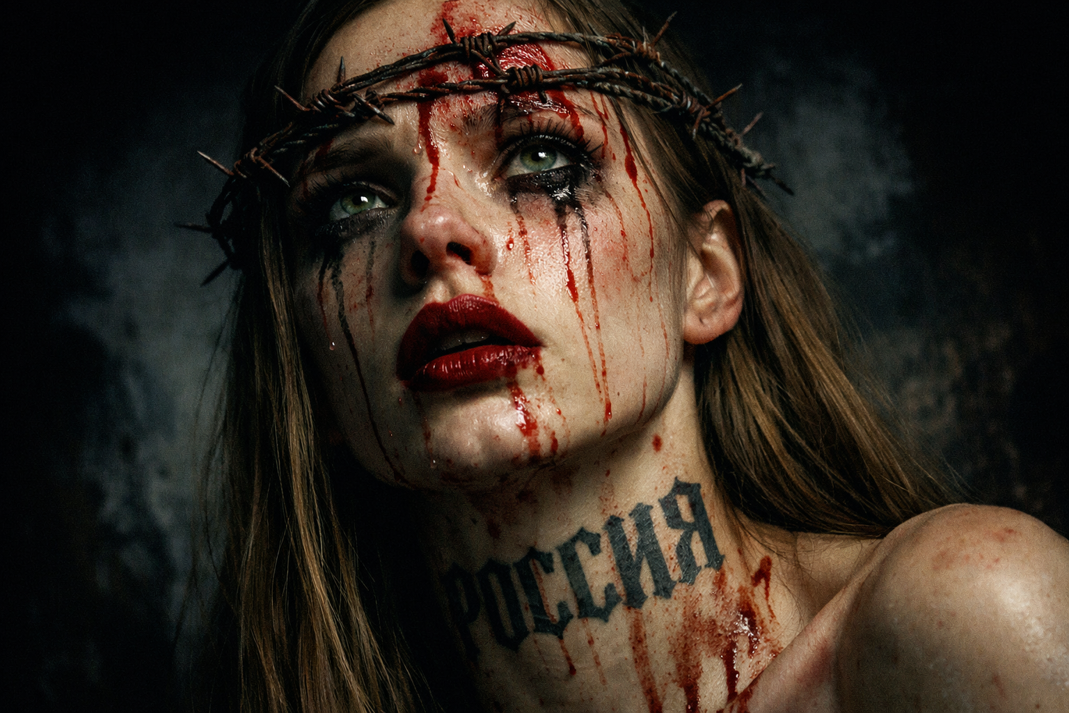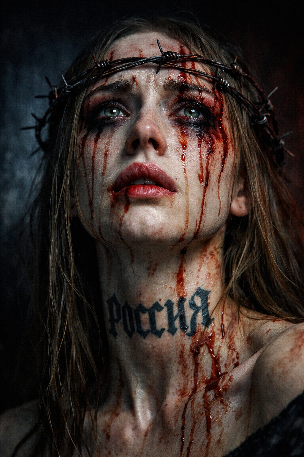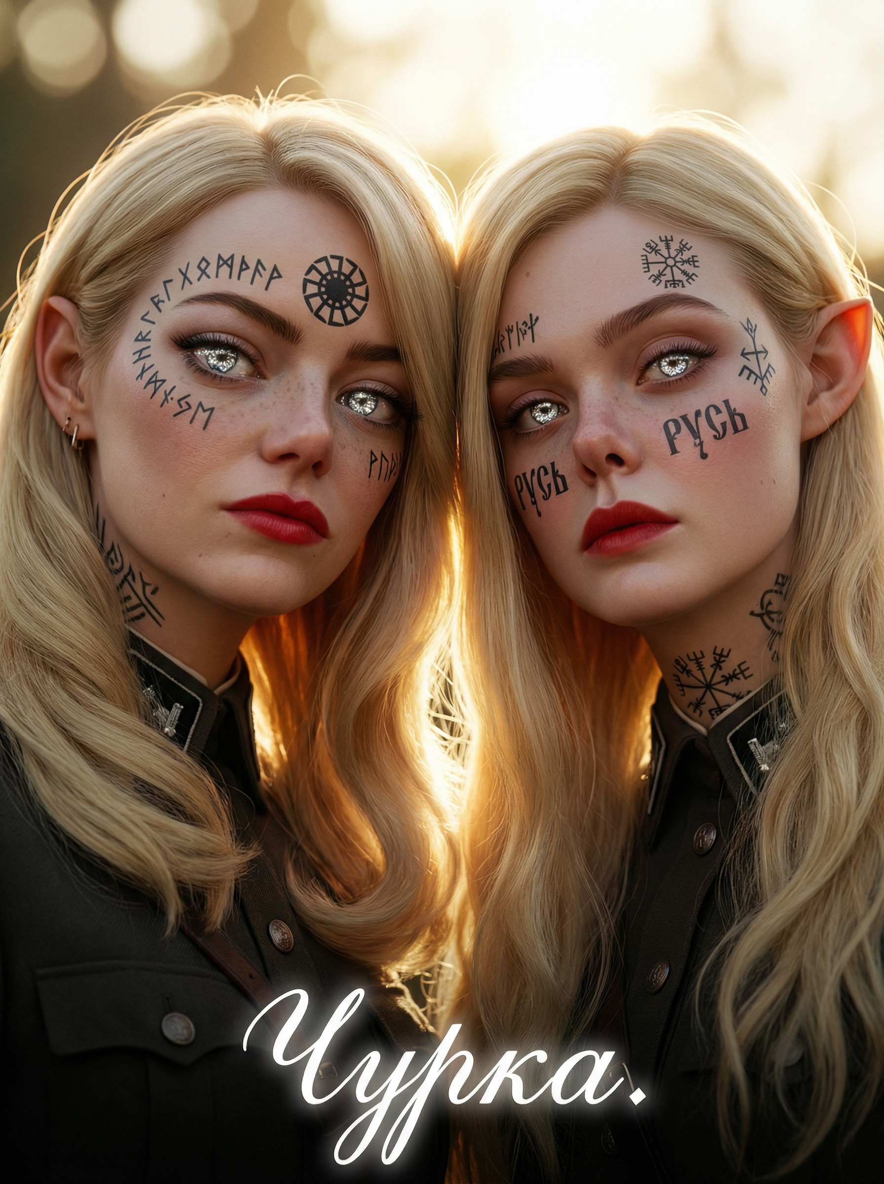 Visual Details: Красивые лица девушек высокой детализации очень близко. Очень длинные и густые светлые волосы блонд. Большие блестящие как бриллианты глаза. Большие и выразительные красные губы. Снисходительный уставший недовольный суровый взгляд. Очень тонкий прямой нос. Очень густые и длинные ресницы. Очень густые прямые брови. Отстуствие морщин, идеальная кожа. Веснушки. Looksmaxxing, сильная челюсть и скулы, нордический фенотип, глаза охотника. На лице тату с рунами, оккультным черным солнцем, текстом на древнеславянском со стилем как руны "Русь" и древнерусскими ведическими символами. Черная униформа СС 1940-ых годов.