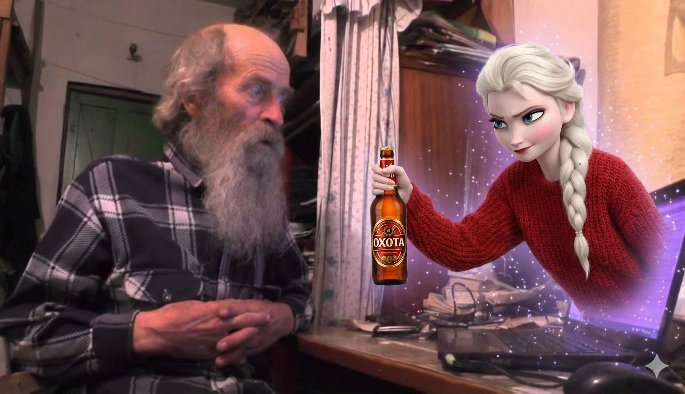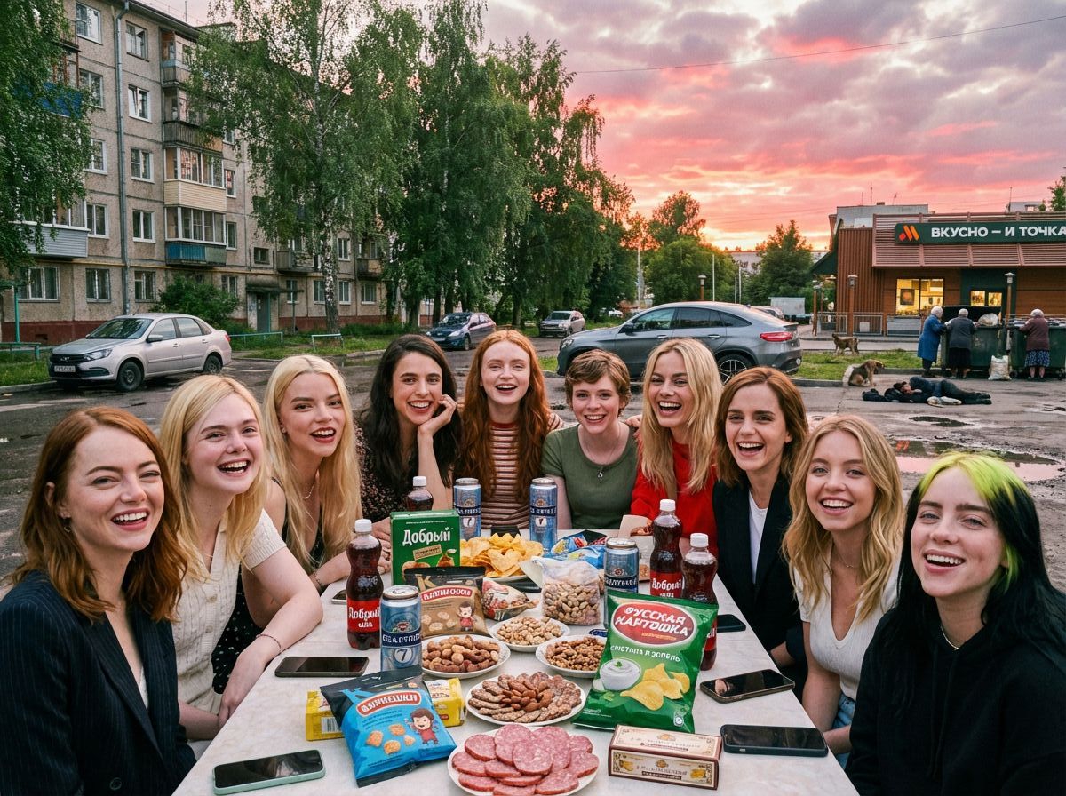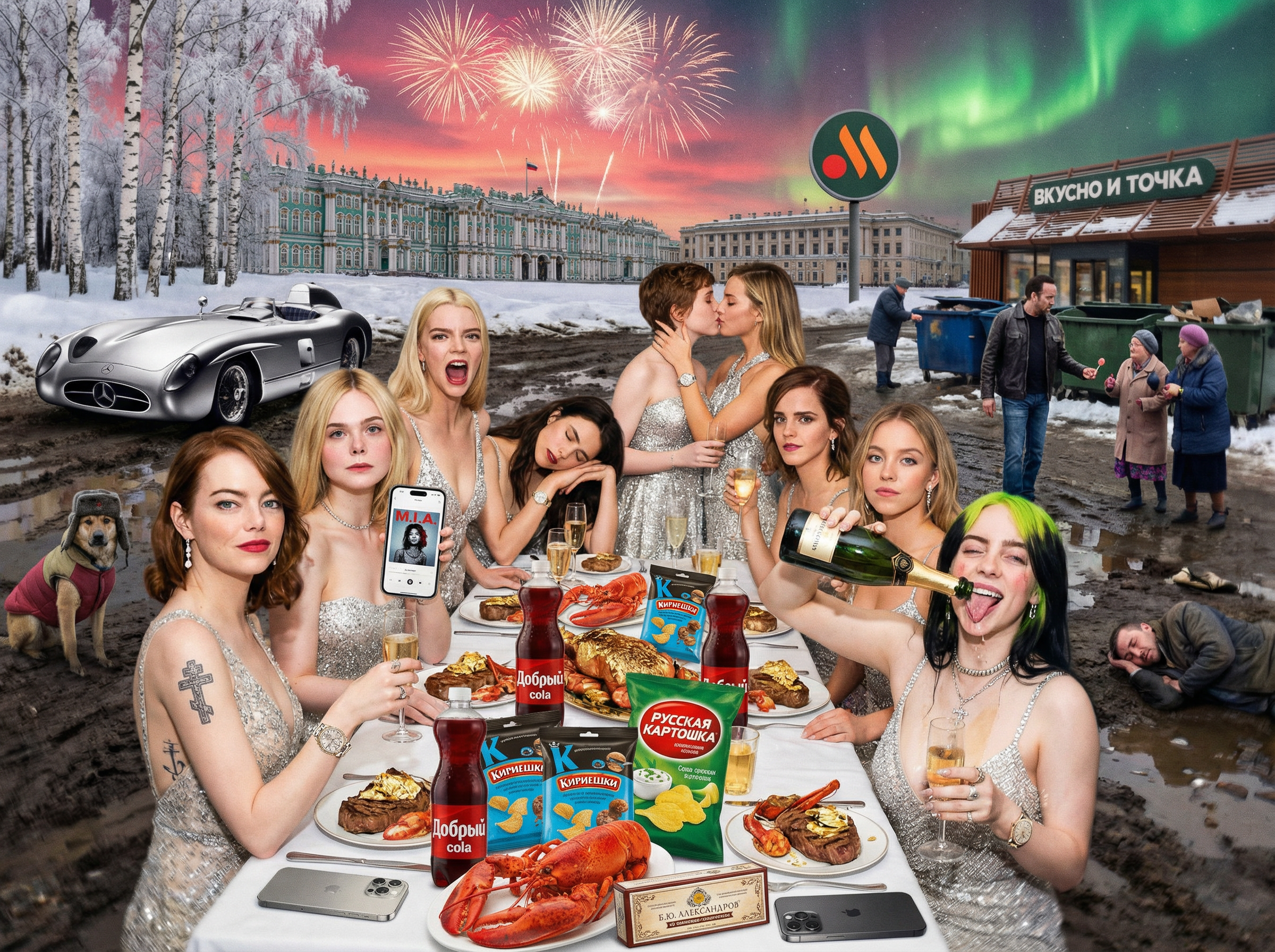 Вечер, зима, снег, натуральное естественное фото сделанное на айфон, голландский угол, движение сцены, салют, 4:3, вид снизу, близко, портрет, веселятся и отдыхают на застолье, держат в руках бокалы детского шампанского, на столе добрый cola и кириешки и омары и стейки покрытые золотом и чипсы русская картошка со вкусом сметана и зелень, и сырок б.ю. александров и айфоны 17 pro max, все актрисы одеты в бриллиантовые дорогие платья и часы rolex, emma stone face с татуировками православных крестов на руках и elle fanning face держит в руках экран айфона с отчетливо видной обложкой "m.i.a. - bad girls" и кричащая anya taylor-joy face и спящая margaret qualley face и очень пьяная sadie sink face и sophia lillis face целует margot robbie face и emma watson face и sydney sweeney face и billie eilish face показывает ахегао и льющая на себя шампанское, чёрно-белый зимний дворец, пушистые красивые берёзки, красно-розовый закат и северное сияние, 1955 mercedes-benz 300 slr из загруженного фото, вкусно и точка, бездомные собаки одетые в советские ватные фуфайки и шапки ушанки, спящие толстые пьяные русские алкаши на земле, лужи и грязь, разбитые дороги, Николас Кейдж из фильма воздушная тюрьма дает леденец русским бабушкам которые танцуют fortnite танец возле мусорных баков возле вкусно и точка
