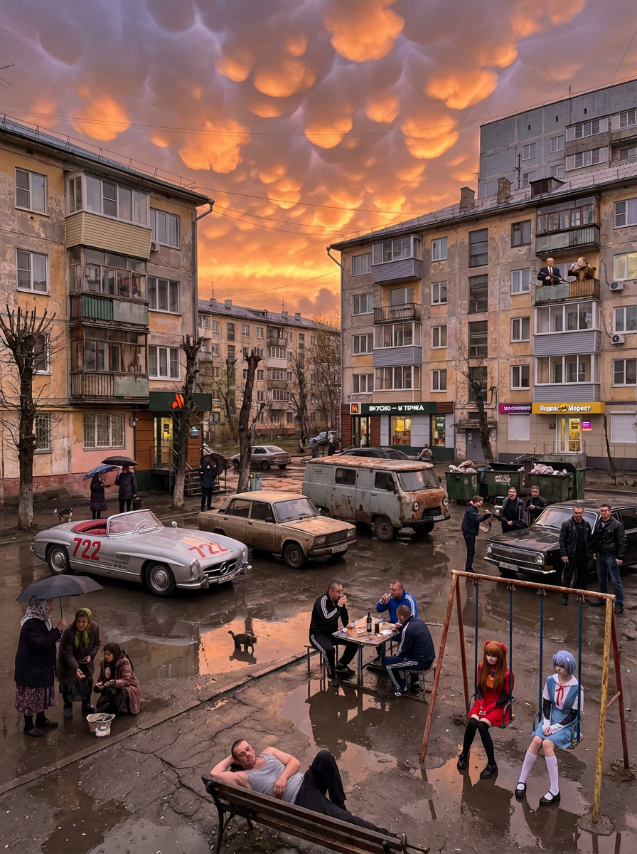 3:4 aspect ratio, below view, russian samara courtyard with soviet apartment buildings rain reflections, 1959 mercedes-benz 300 slr кабриолет 722 mille miglia winner, невероятно красивый закат с невероятно детальными воздушными как вата облаками, разбитый асфальт и ямы, машины лада и ваз и газель and люди and вкусно и точка and wildberries and яндекс маркет and бездомные собаки and кронированные деревья and бомжи and алкаши гопники в adidas застолье во дворе and спящие толстые пьяные русские мужчины в майке алкоголичке на земле and хоббихорсеры and бездомные кошки and тиктокеры снимающие тикток как они пинают мусорную урну and anine styled asuka soryu langley вместе с rei ayanami both with emo hairstyles катаются на качелях and голодные русские бабушки and цыгане попрошайки and братки из 90-ых возле машины Волги с пистолетами and Трамп на балконе держа в руках за головой винтовку вместе с Путиным пьющим водку Путинка сидящем на ревущем медведе and помойные баки in background