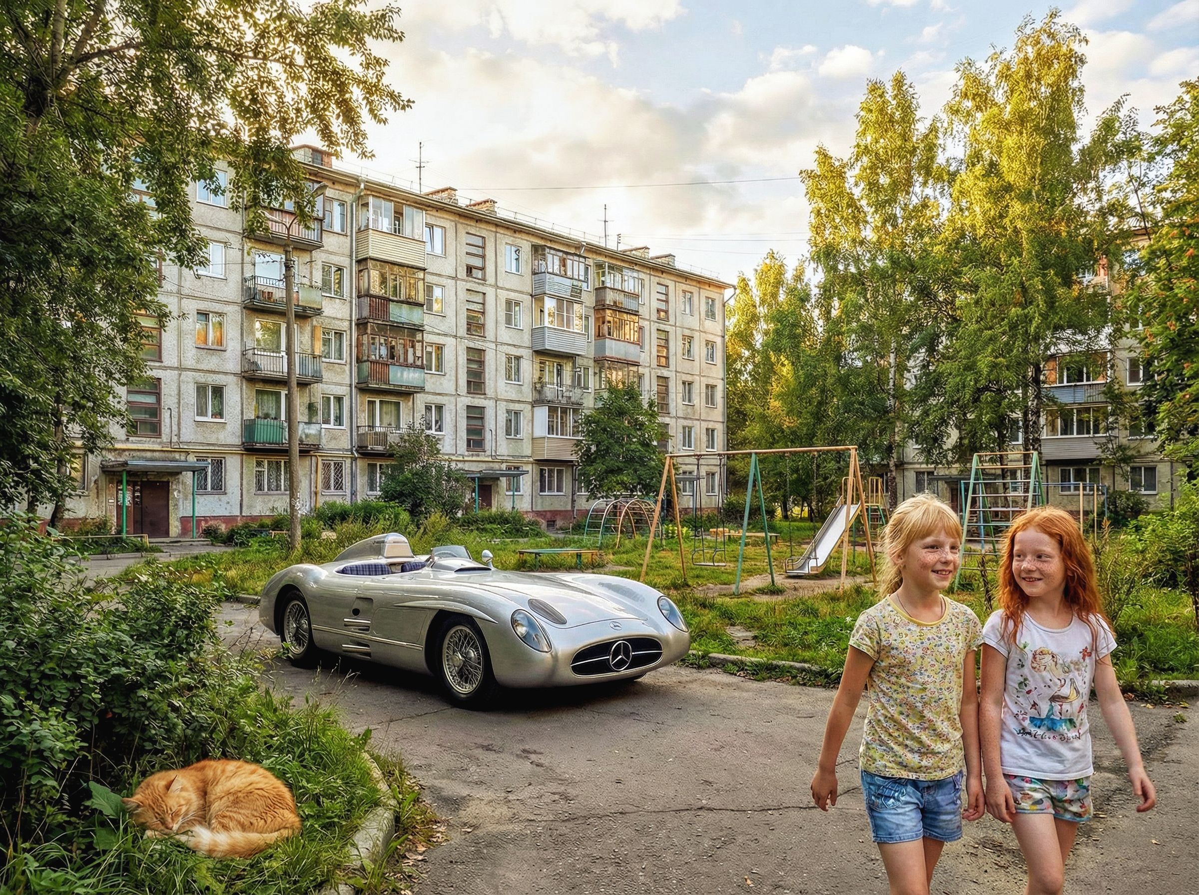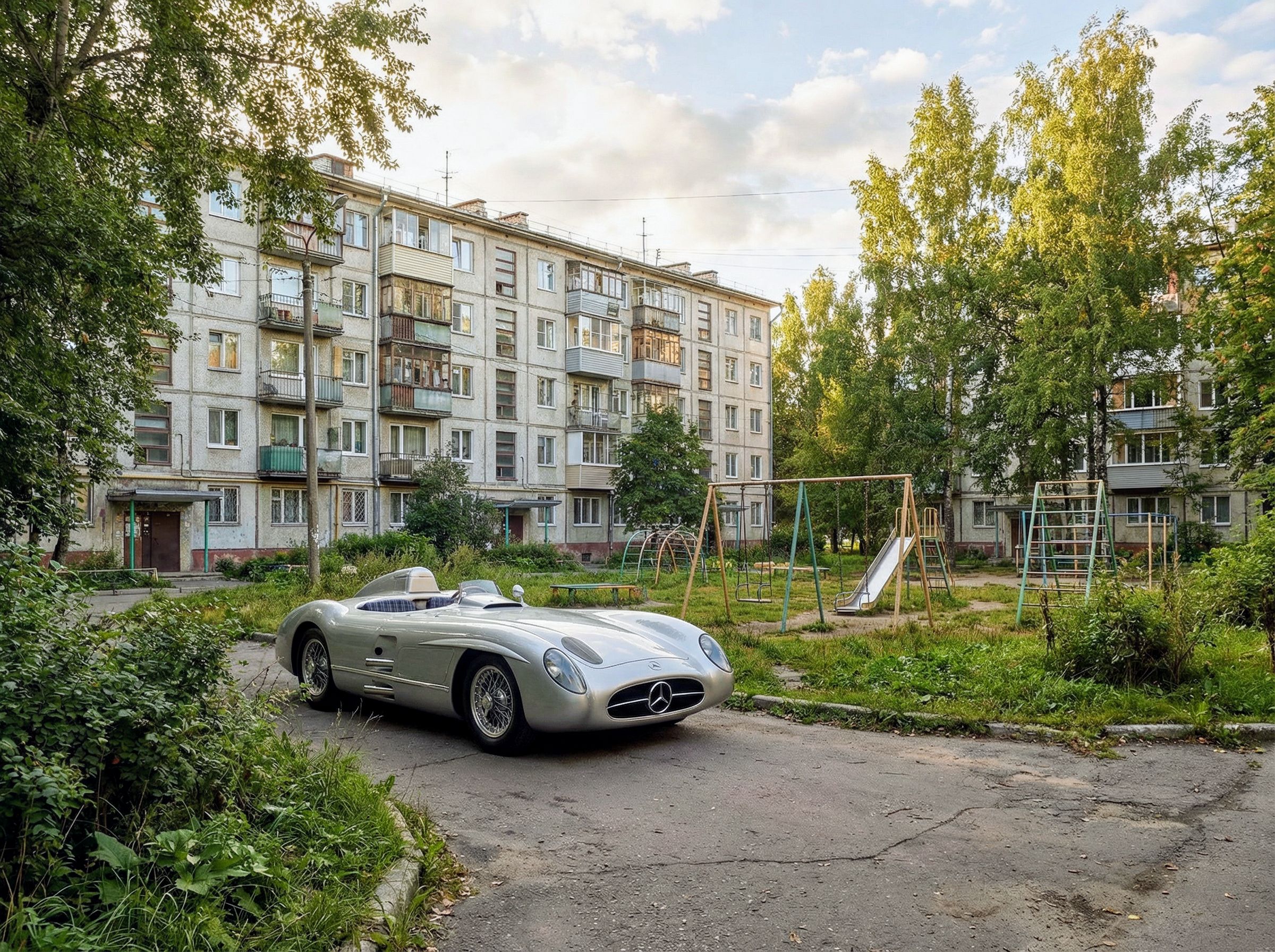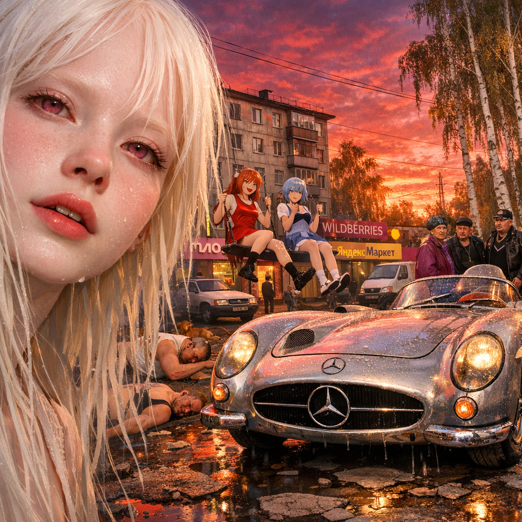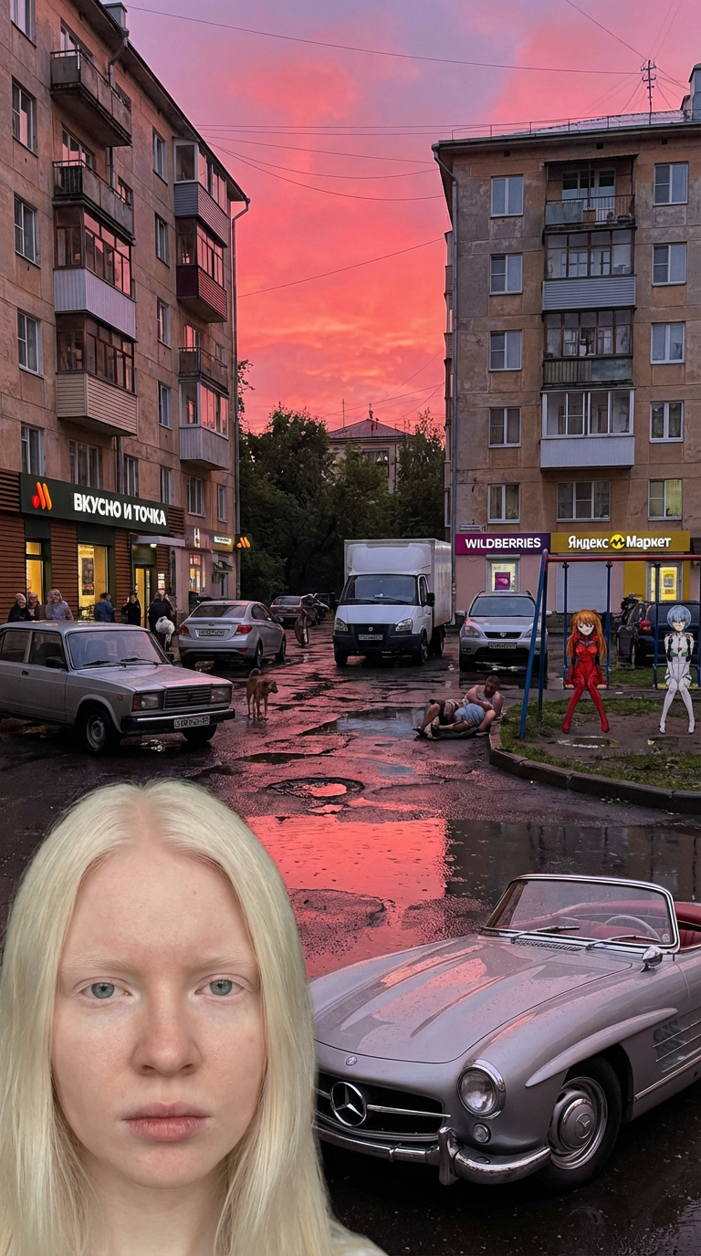 9:16, вид снизу, близко, русская 20 летняя девочка альбинос лицо передний план близко, 1959 mercedes-benz 300 slr передний план, все остальное сзади, российский двор пятиэтажки дождь отражения пушистые красивые берёзки, невероятно красивый красно-розовый закат, разбитый асфальт и ямы, лада, ваз, газель, тойота, люди, вкусно и точка, wildberries, яндекс маркет, бездомные собаки, спящие очень толстые пьяные русские алкаши в майках алкоголичках на земле, хоббихорсеры прыгают, нарисованные как в аниме asuka soryu langley и rei ayanami катаются на качелях, русские бабушки, братки из 90-ых