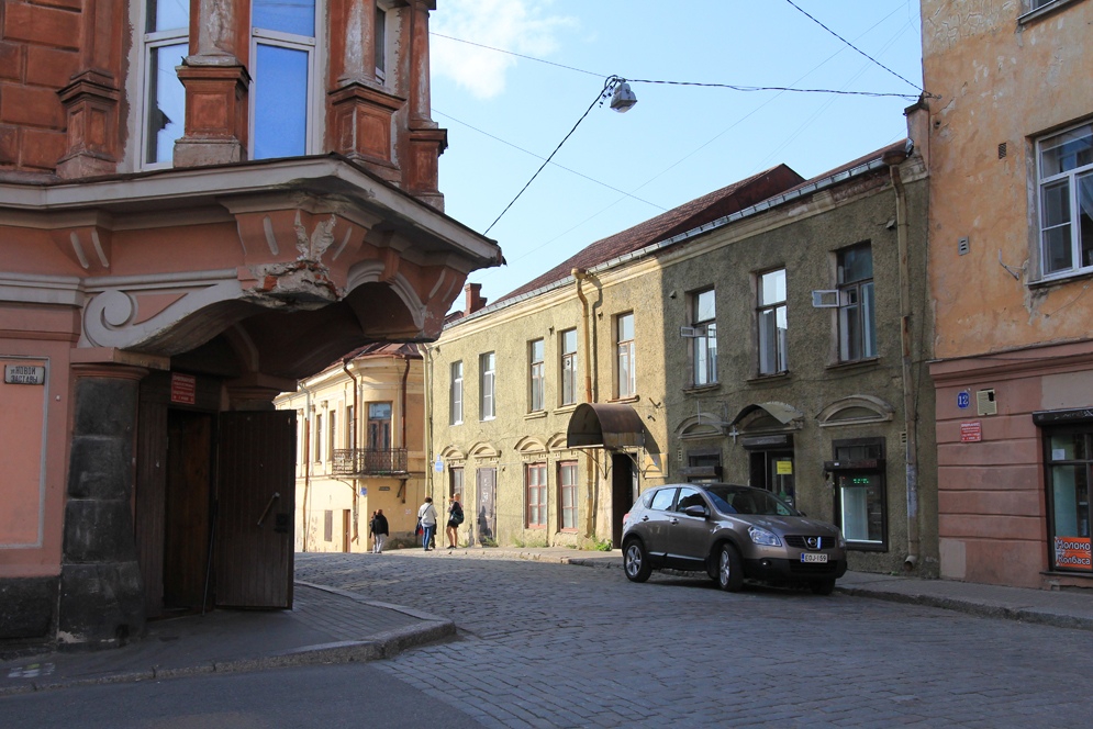 4:3 aspect ratio, слегка солнечный полдень, metallic silver car from photo looks natural organic stands further away, российский двор пятиэтажки подъезды деревья небо облака трава кусты советская игровая площадка качели